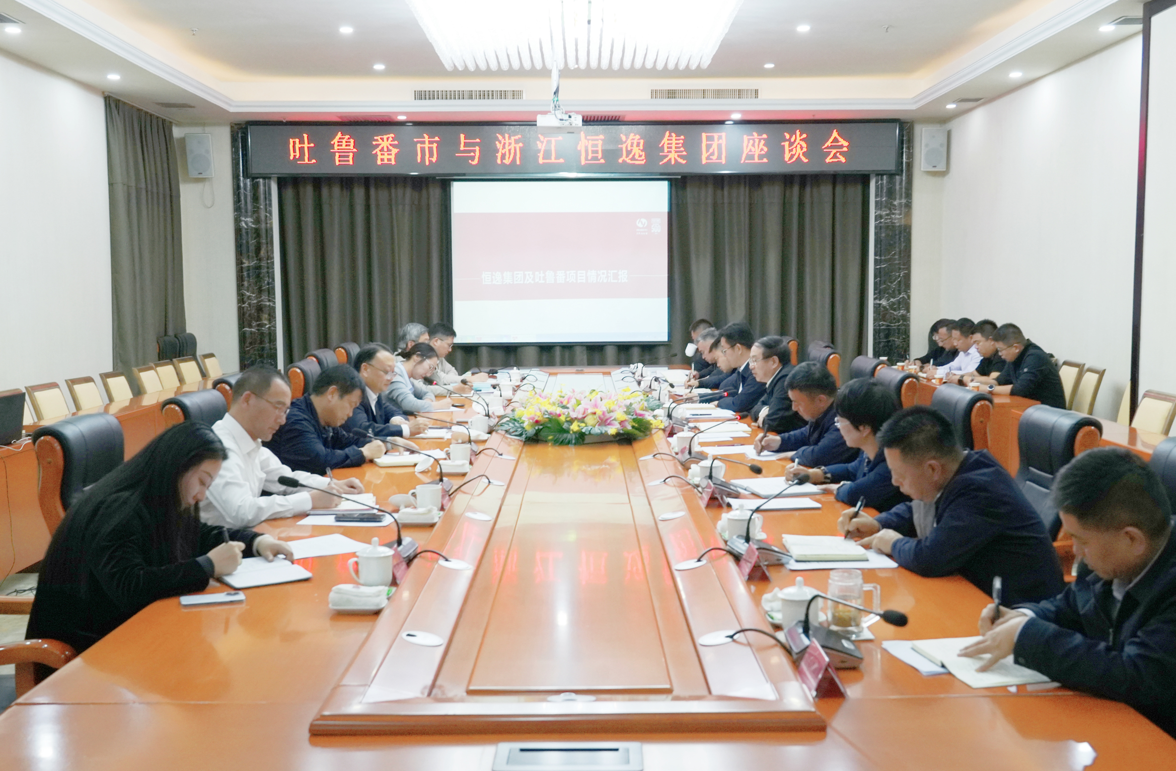 10月14日下午,市委书记文天平会见来吐鲁番深化合作的浙江恒逸集团总裁倪德锋一行,双方就项目合作事宜进一步深入交流。图为座谈现场。吐鲁番市融媒体中心记者 彭丹妮 摄