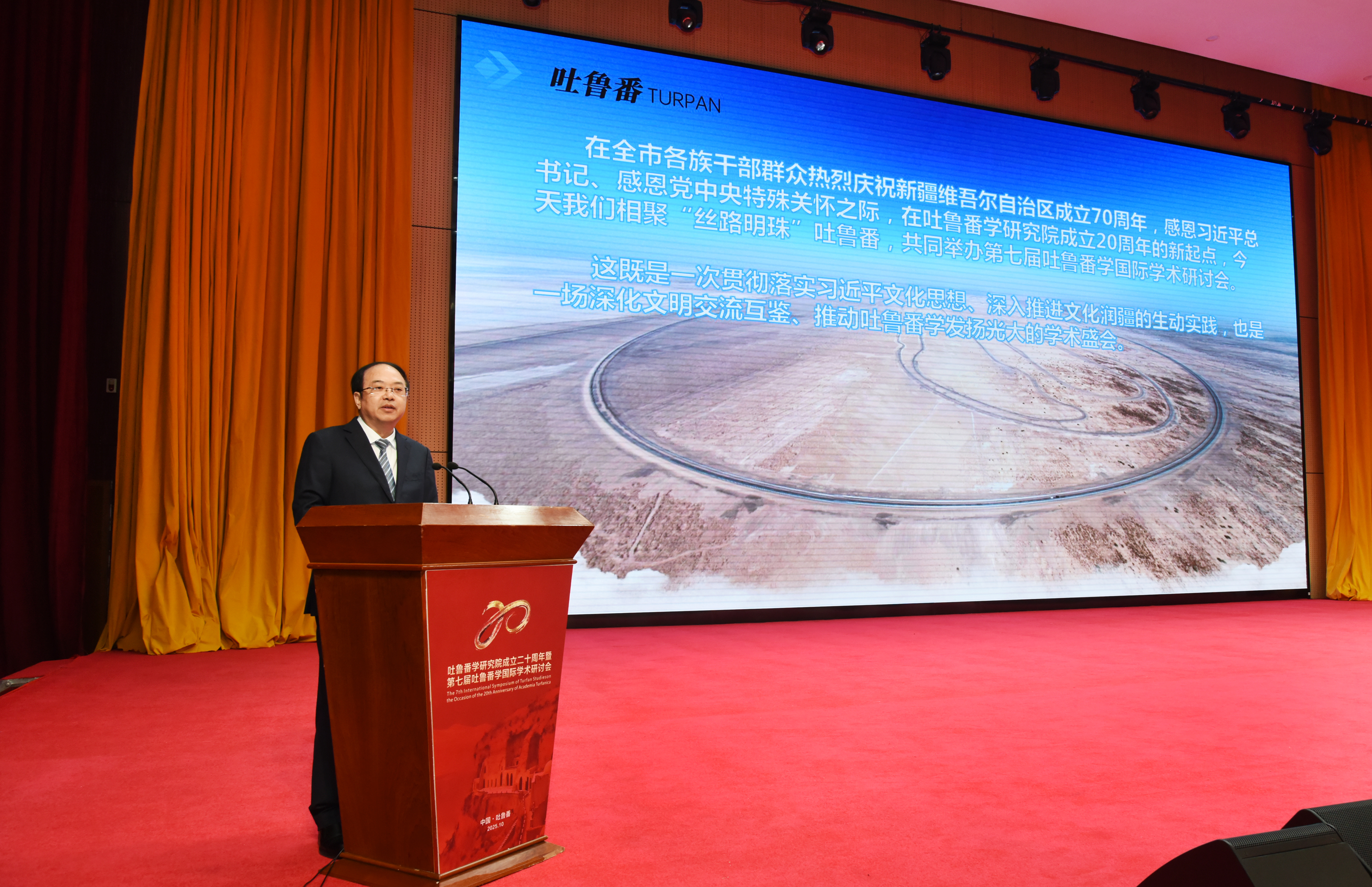文天平代表吐鲁番市四套班子向与会专家学者和嘉宾表示欢迎,向长期关心支持吐鲁番发展的各界人士和国际友人致以衷心感谢。文天平说,举办吐鲁番学国际学术研讨会,既是贯彻落实习近平文化思想、深入推进文化润疆的生动实践,也是深化文明交流互鉴、推动吐鲁番学发扬光大的学术盛会。吐鲁番学熔铸古今、博大精深、贯通中西,在中外学术机构、专家学者潜心研究和弘扬传播下,成果丰硕、蓬勃发展、名扬四海,已由“残卷散轶”全面“复原新生”、已由“西域孤证”蝶变“丝路文明”、已由“冷门绝学”成为“国际显学”。奋进新征程,希望以此次研讨会为契机,紧跟时代步伐、勇担历史使命,生动阐释历史价值,共同探寻民族融合密码;深入发掘时代价值,共同凝聚向上向善力量;充分彰显文化价值,共同推动赓续传承创新;精彩展现世界价值,共同为构建人类命运共同体贡献力量,推出更多有创新、有突破、有影响的研究成果,让吐鲁番学在新时代绽放新光彩,以文化软实力赋能吐鲁番现代化建设。