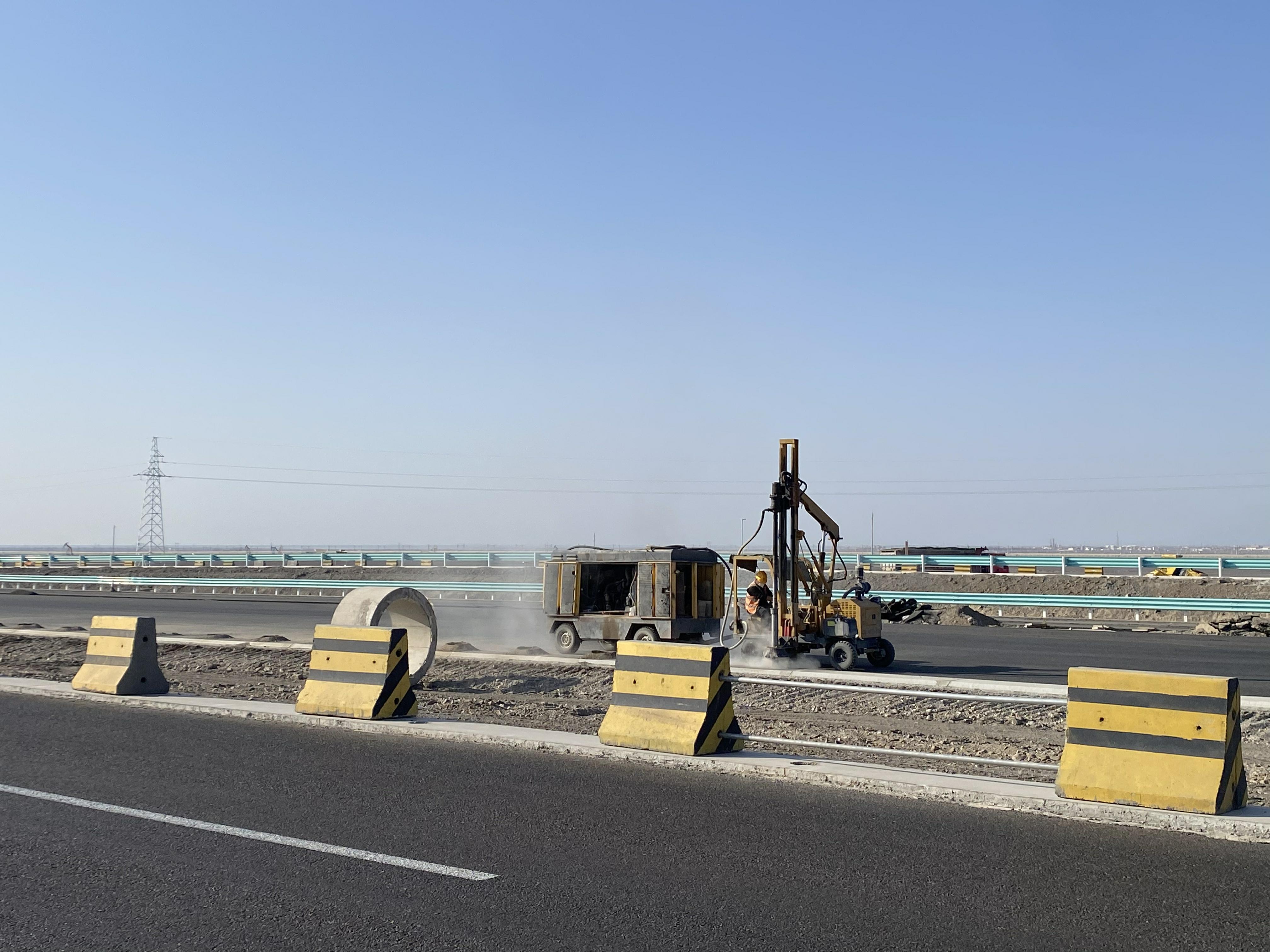 工人进行波形梁护栏打桩作业。
