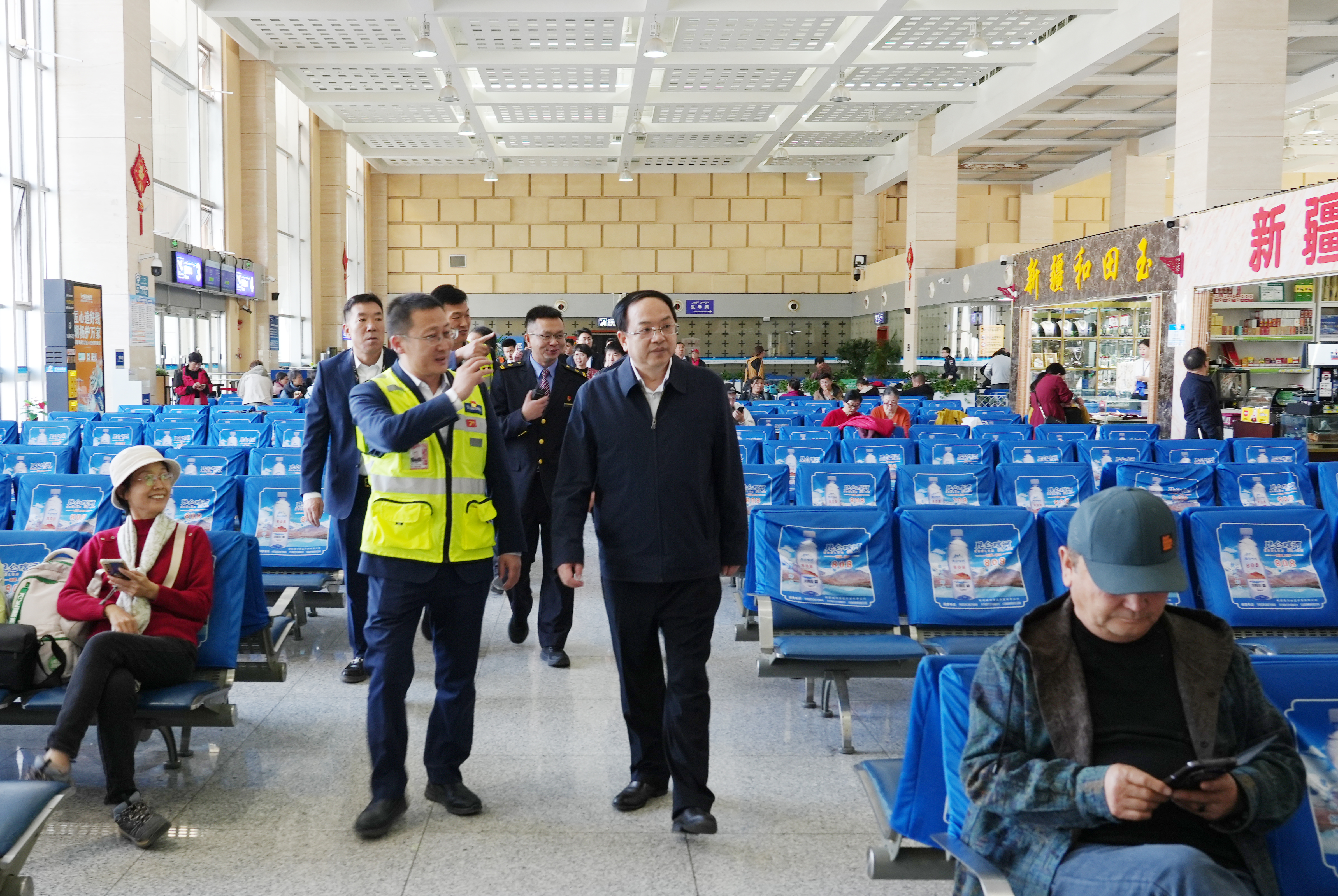 在吐鲁番北站,文天平详细了解候车大厅服务设施配置、安全生产及运行保障等情况。吐鲁番市融媒体中心记者 李彦强 摄
