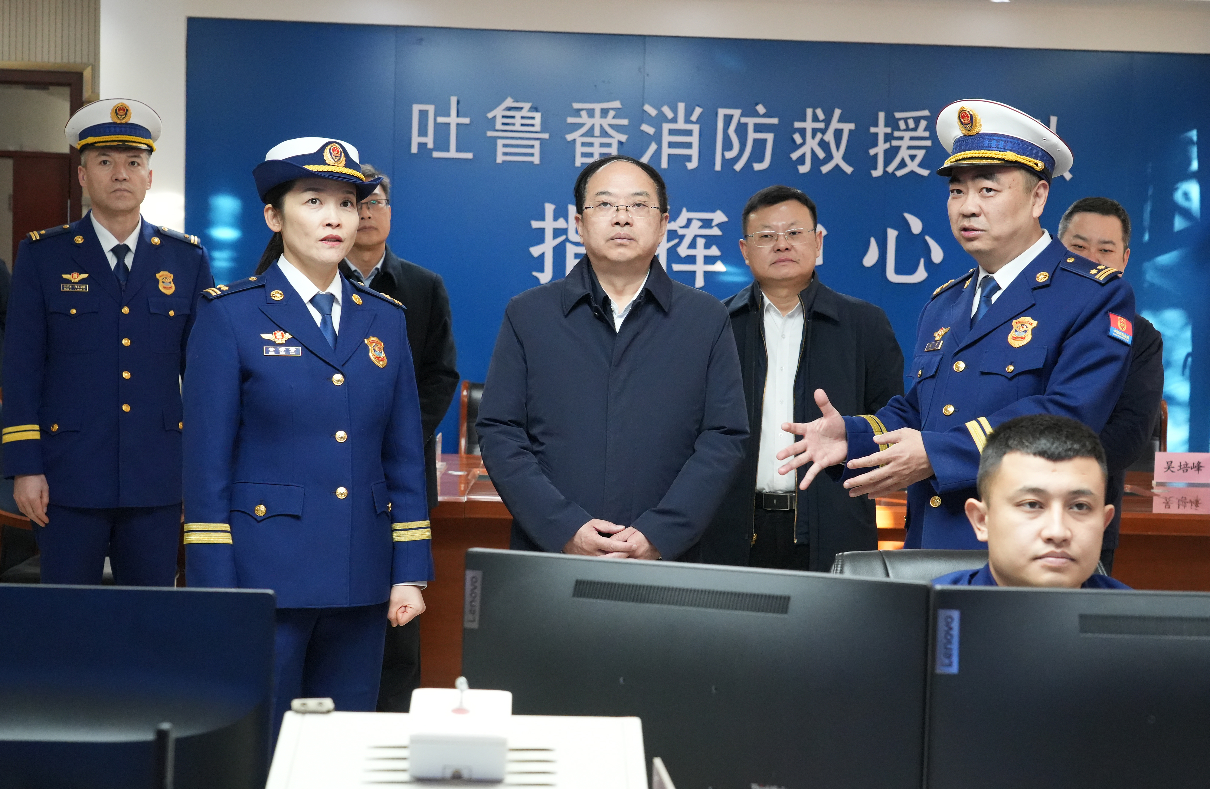 在市消防救援支队,文天平详细了解119接警中心日常运行、装备配备及消防救援能力建设等情况。吐鲁番市融媒体中心记者 李彦强 摄