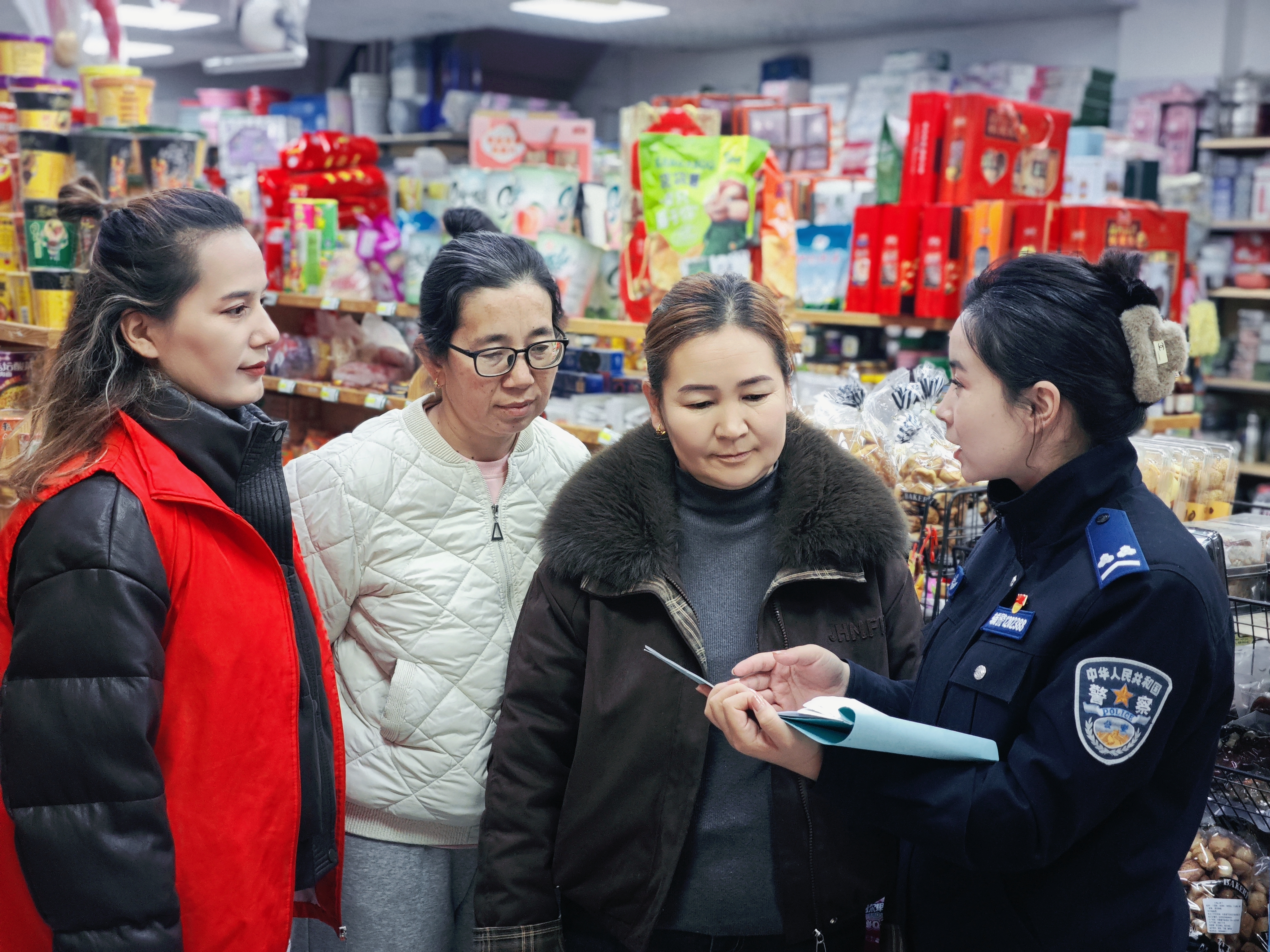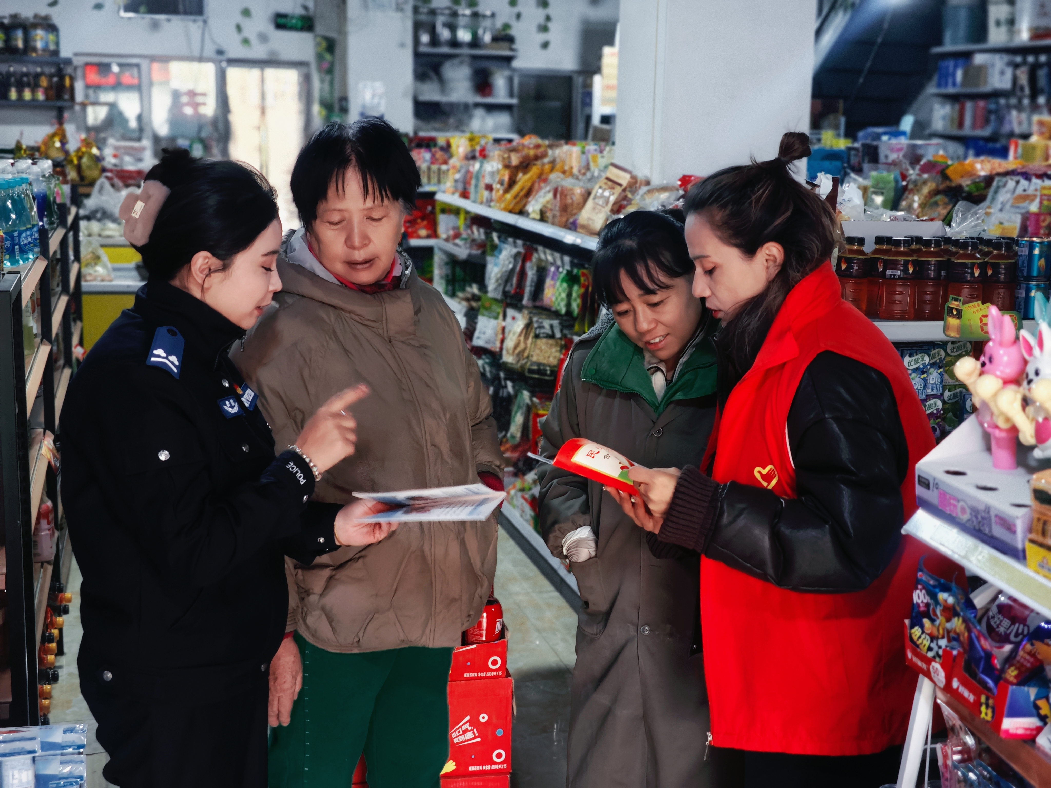 社区志愿者向居民发放反家暴宣传单、现场解答疑惑。