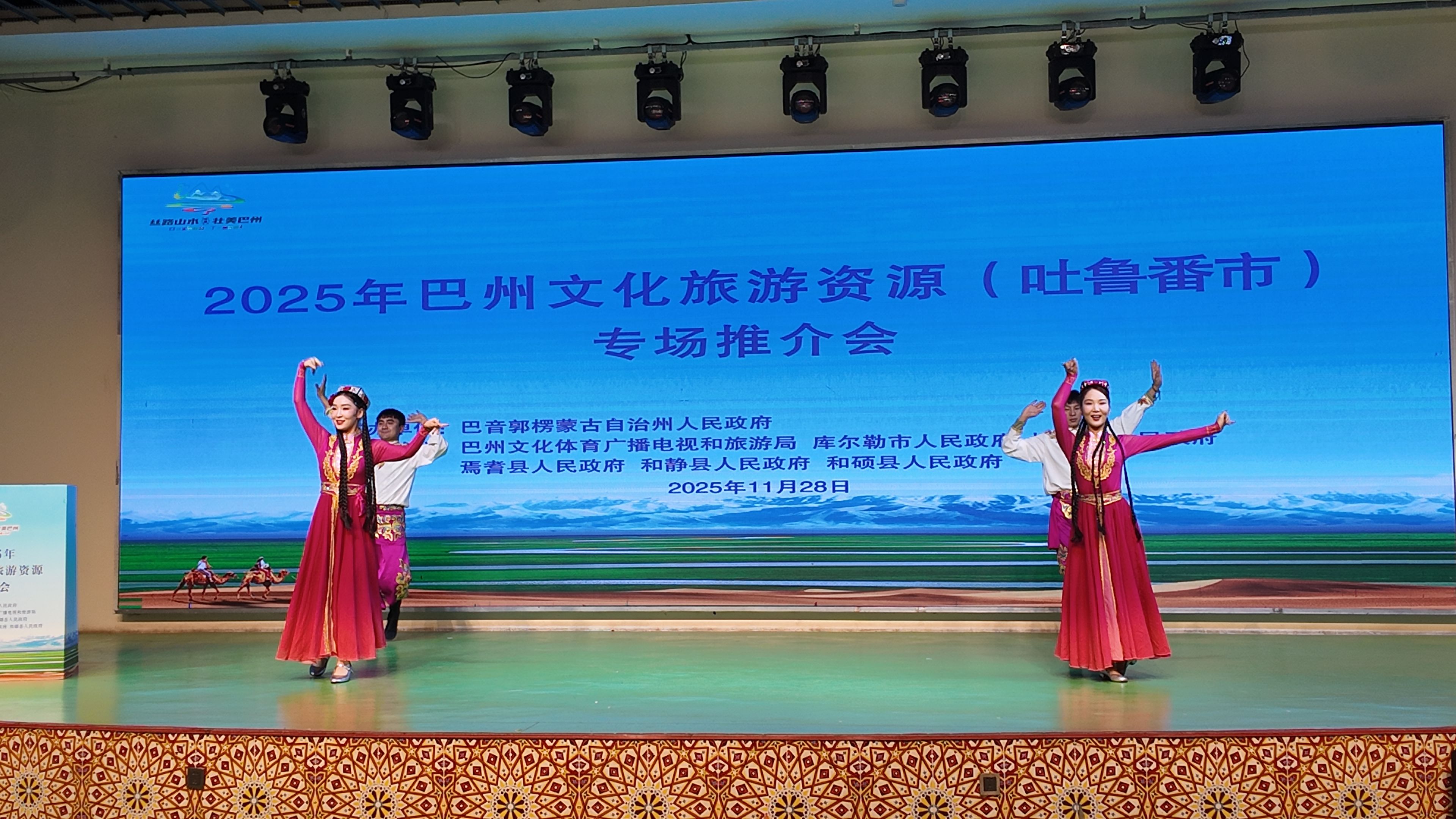 推介会上,巴州文旅宣传片与冬季旅游宣传片生动呈现了当地独特的自然风光与人文底蕴。巴州文旅推介官系统介绍了从“塞外明珠·山水梨城”都市风情到巴音布鲁克九曲十八弯自然奇观的丰富旅游资源。《萨吾尔登》《天堂》等特色文艺表演轮番上演,让与会嘉宾沉浸式感受巴州独特的文化魅力。