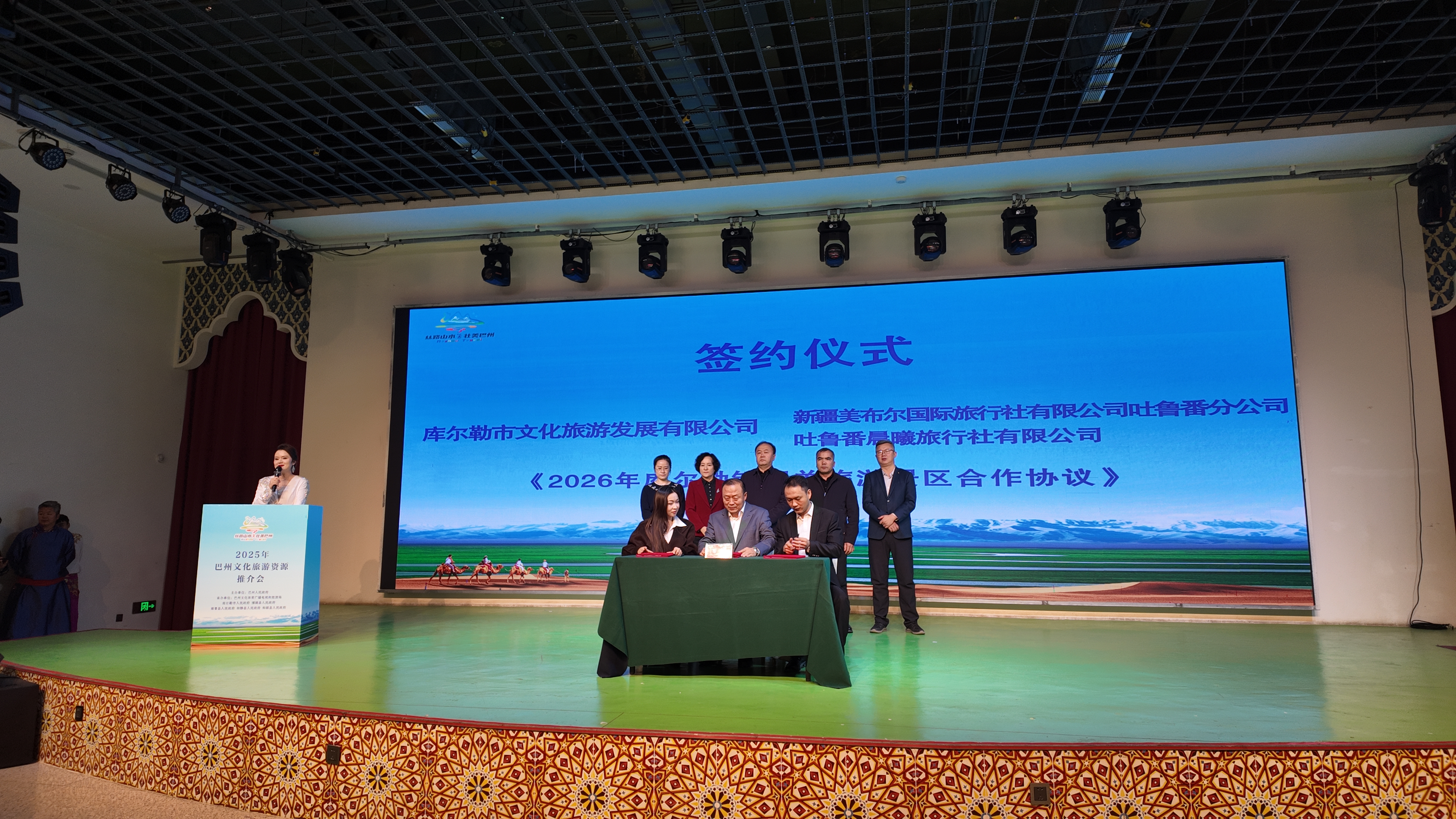 在签约环节,巴州天鹅湖旅游开发有限责任公司、和硕文化旅游投资集团有限公司等巴州文旅企业,分别与吐鲁番阳光旅行社有限责任公司、新疆梦天山旅行社有限公司、新疆路仕达国际旅行社有限公司、吐鲁番晨曦旅行社有限公司等企业签署合作协议。根据签约,两地企业将通过“资源共享、优势互补、客源互送、线路共建”等方式,共同拓展市场空间,推动两地文旅市场双向赋能。