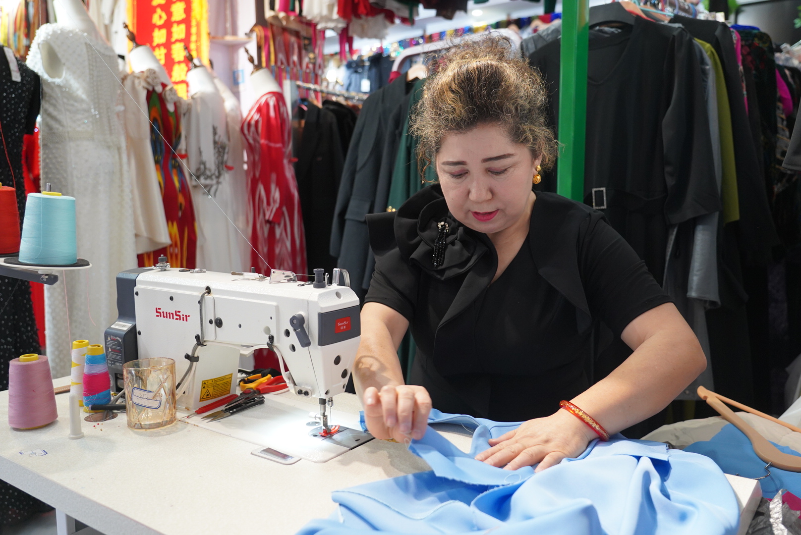 夏扎迪古丽的裁缝生涯已跨越三十余载。十五岁那年,她拜师学艺,凭借满腔热忱与过人天赋,仅用三年时间就能独当一面。创业之初,家中一方小小天地是她的起点。随着技艺日臻成熟,她不再甘于方寸之限。2000年,她租赁了一家店面,开启了追梦之旅。