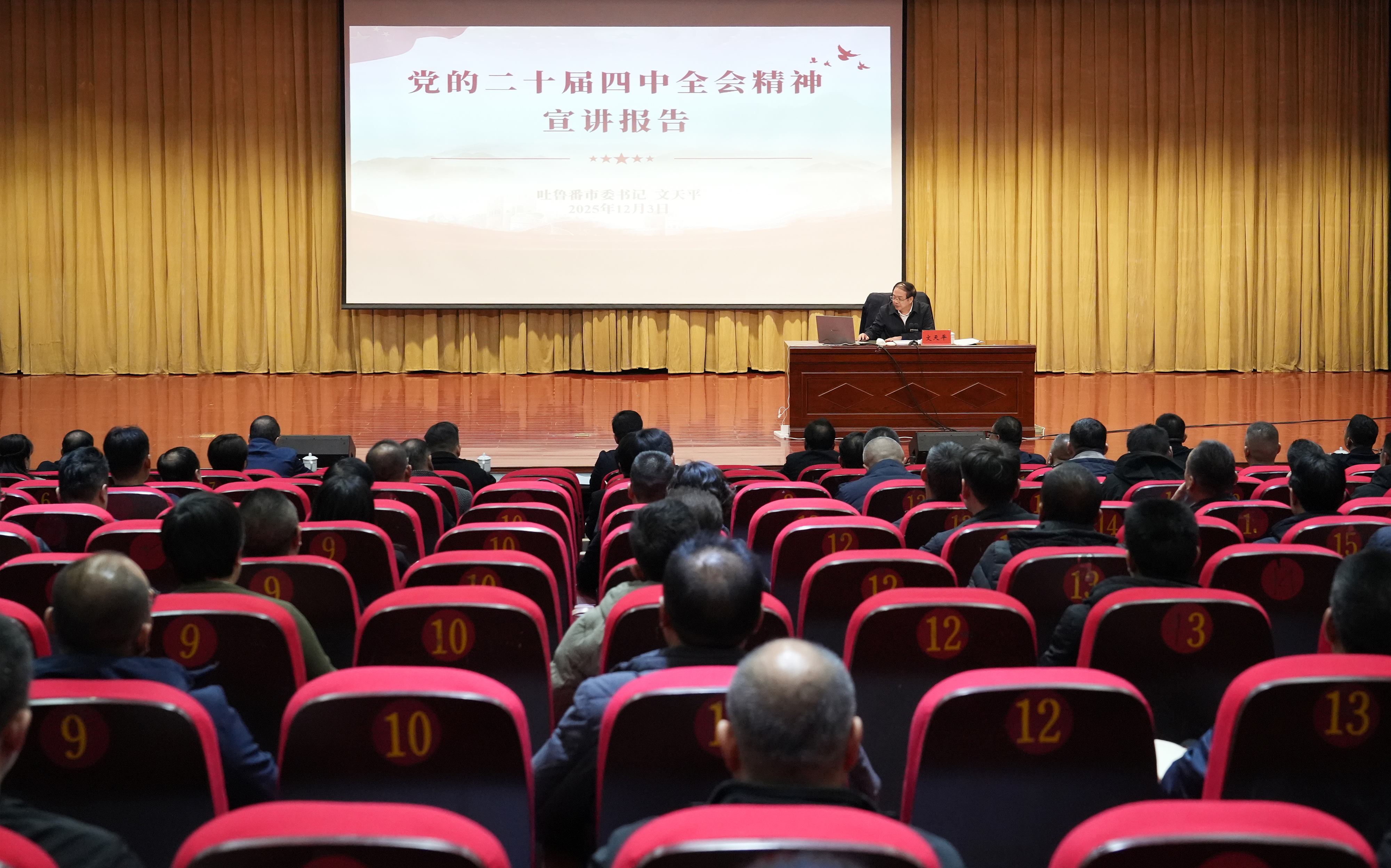 文天平在宣讲中强调,党的二十届四中全会是在即将进入基本实现社会主义现代化夯实基础、全面发力的关键时期召开的一次重要会议。习近平总书记的重要讲话和全会通过的“十五五”规划建议,深刻阐述了“十五五”时期经济社会发展的重大意义、指导思想、重大原则、重大战略任务和根本保证,对未来五年发展作出顶层设计和战略擘画,为确保基本实现社会主义现代化取得决定性进展提供了科学指引。自治区党委十届十五次全会是贯彻落实党的二十届四中全会精神和习近平总书记出席自治区成立70周年庆祝活动期间重要讲话重要指示精神的实际行动,是站在新起点上对新疆“十五五”时期各项工作的战略谋划。文天平紧扣党的二十届四中全会精神特别是习近平总书记重要讲话精神,围绕全会的重大意义、准确把握“十五五”时期在基本实现社会主义现代化进程中的重要地位、深刻领会“十五五”时期经济社会发展的指导方针和主要目标、全面理解“十五五”时期经济社会发展的战略任务和重大举措、坚持和加强党的全面领导等内容,结合自治区党委全会部署和吐鲁番发展实际作了深入系统讲解。