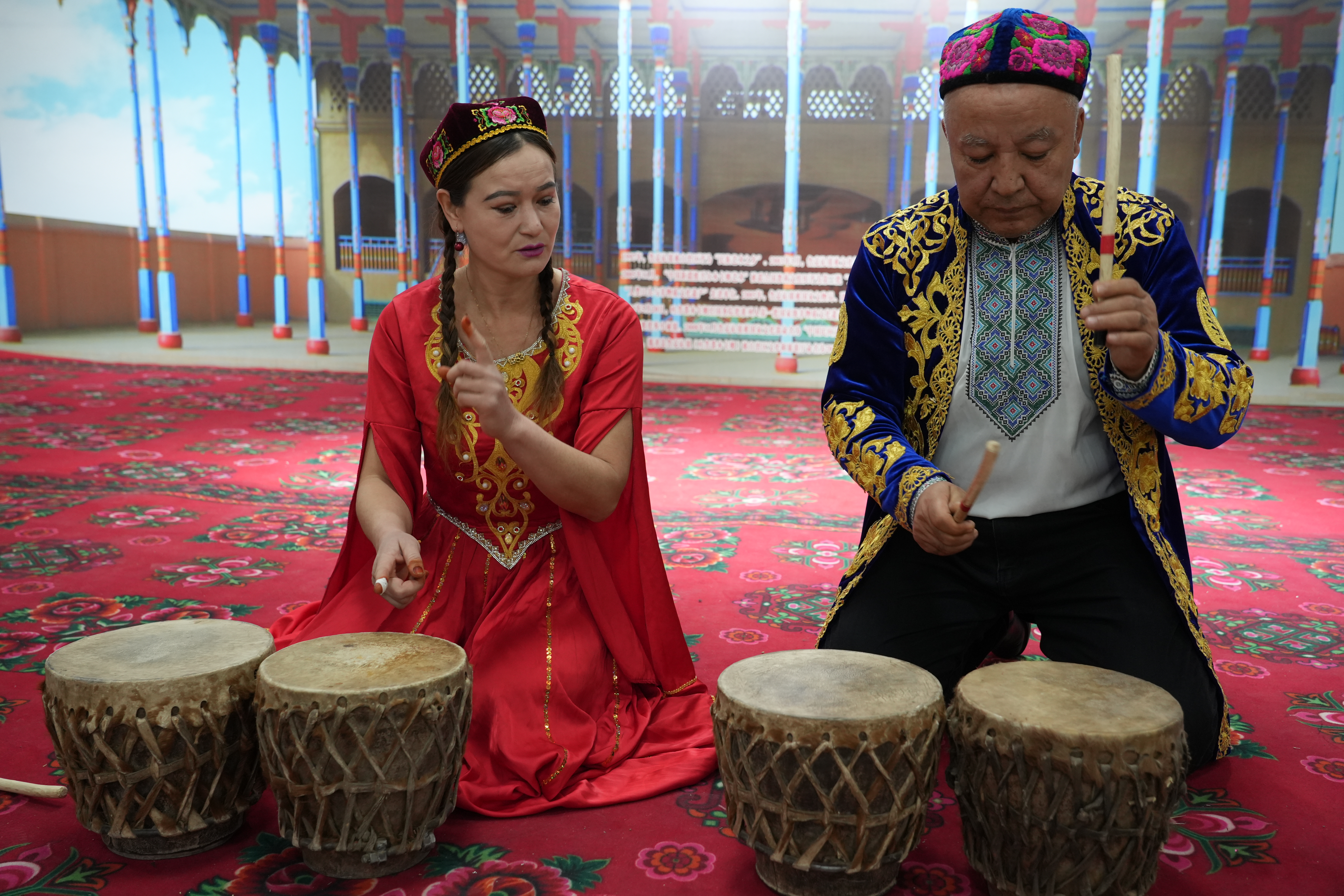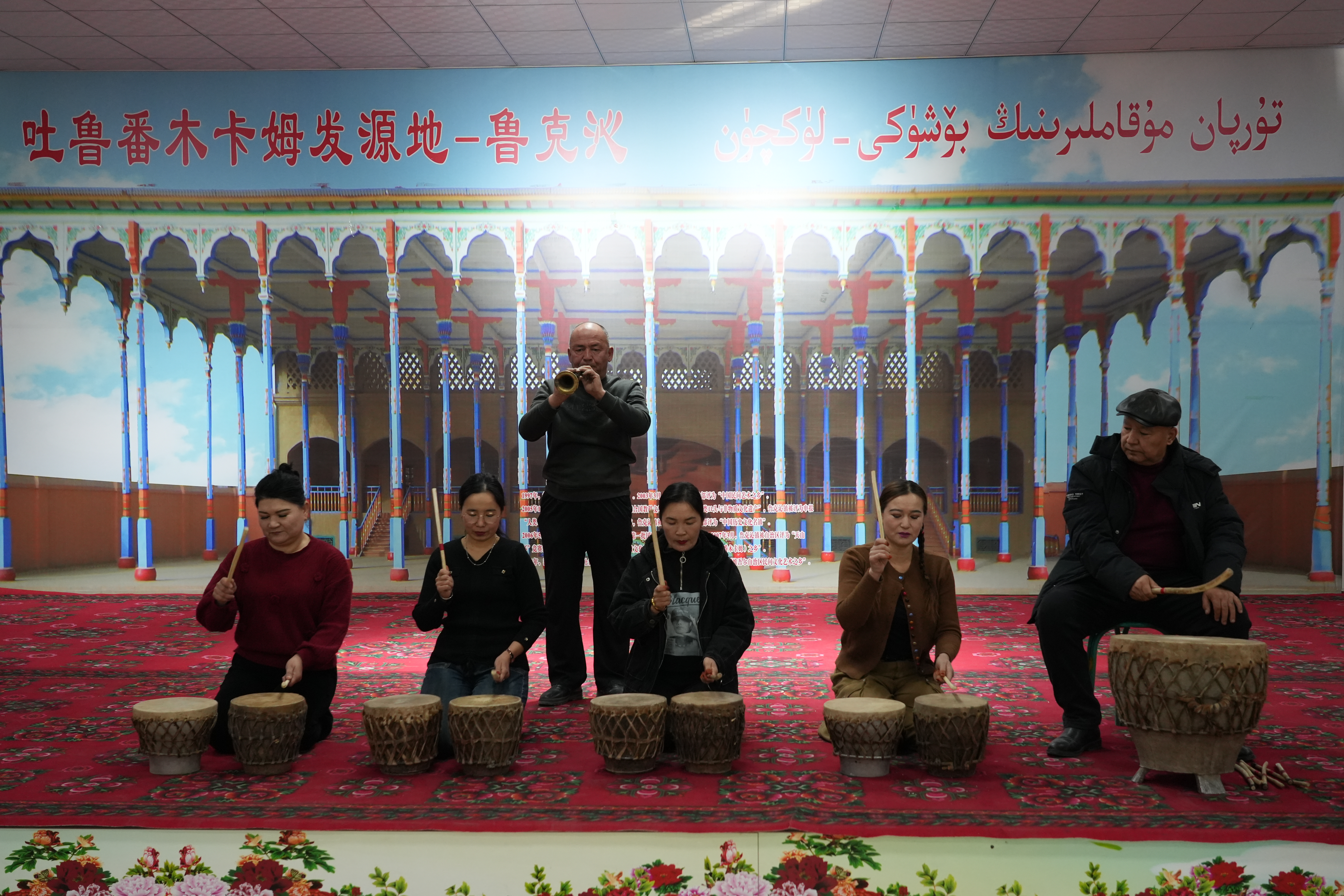 12月2日,鄯善县鲁克沁镇木卡姆村的吐鲁番木卡姆传承中心内,纳格拉鼓与手鼓的声响交织,奏响了吐鲁番十二木卡姆的经典旋律,演奏者是一支全部由女性组成的鼓吹乐队伍。