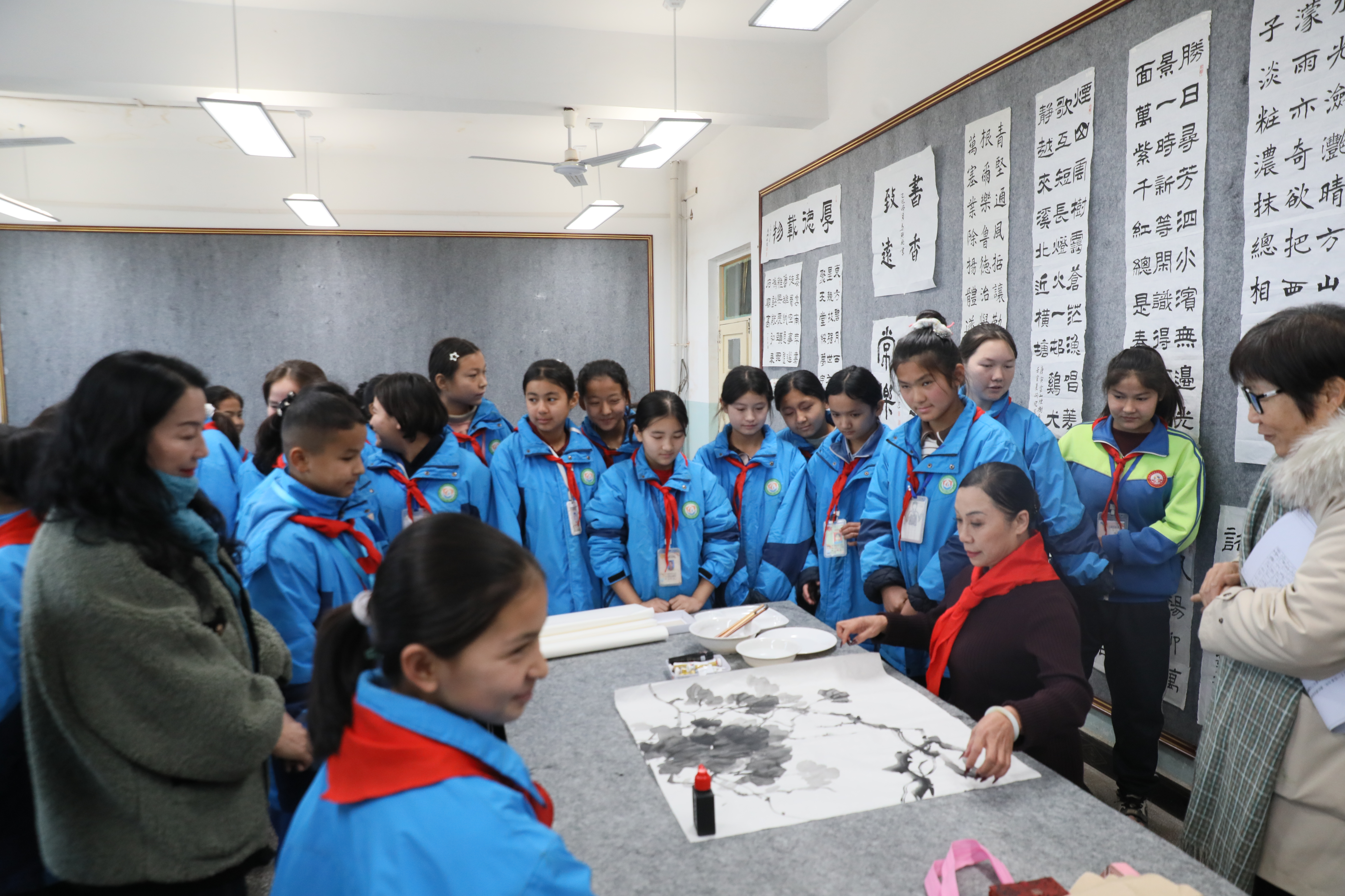 12月5日,鄯善县文联组织县美协、书协在吐峪沟中心学校举办“笔墨传情润童心 文化铸魂育新人”书画捐赠暨美育实践活动。活动中,艺术家们向学校捐赠了十余幅精心创作的书法、绘画作品,并围绕“美育润心”“文化传承”主题现场创作,与师生互动交流。