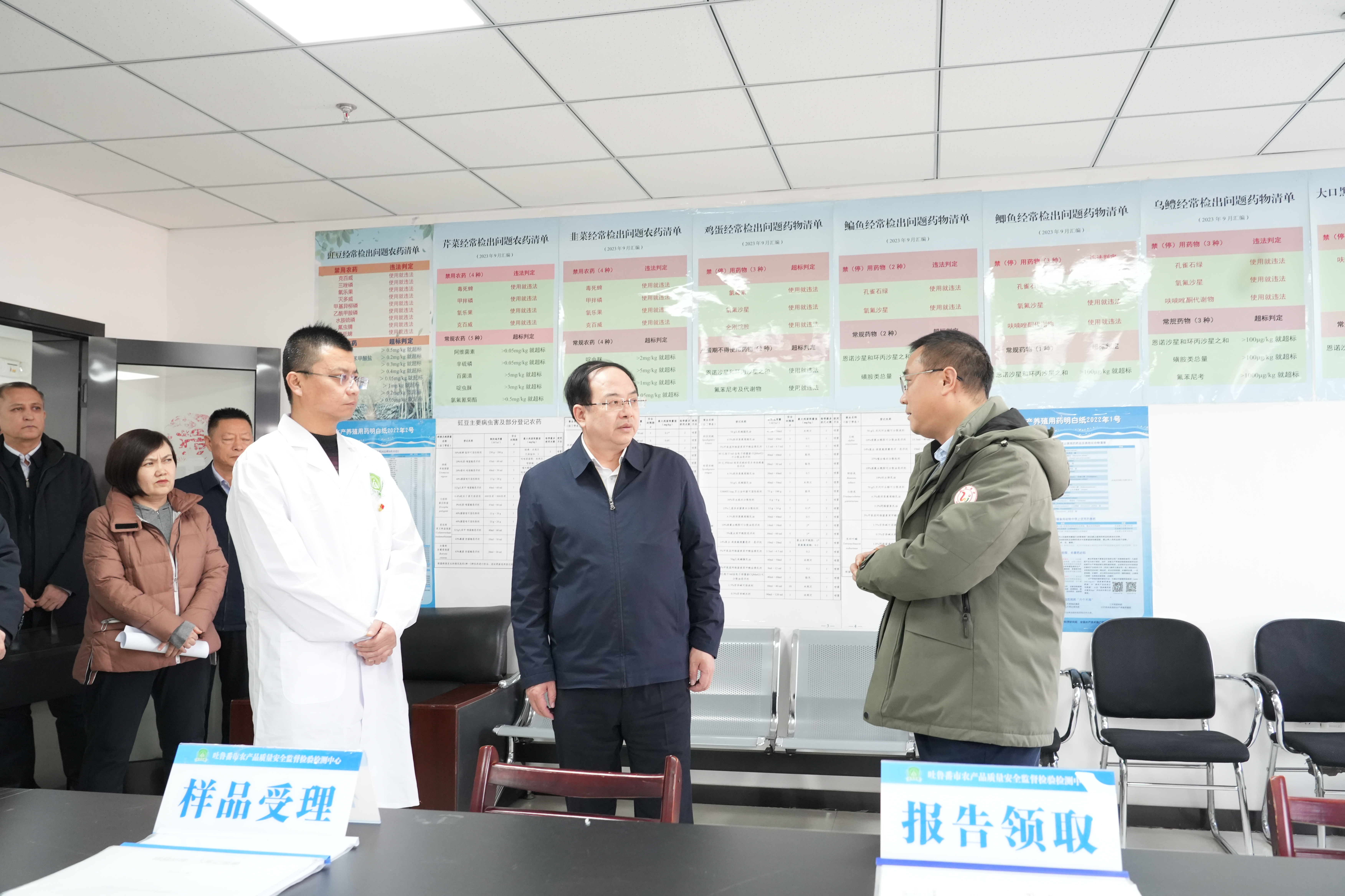 在吐鲁番市农产品质量安全监督检验监测中心,文天平仔细察看人员设备配置及业务开展情况。吐鲁番市融媒体中心记者 彭丹妮 摄