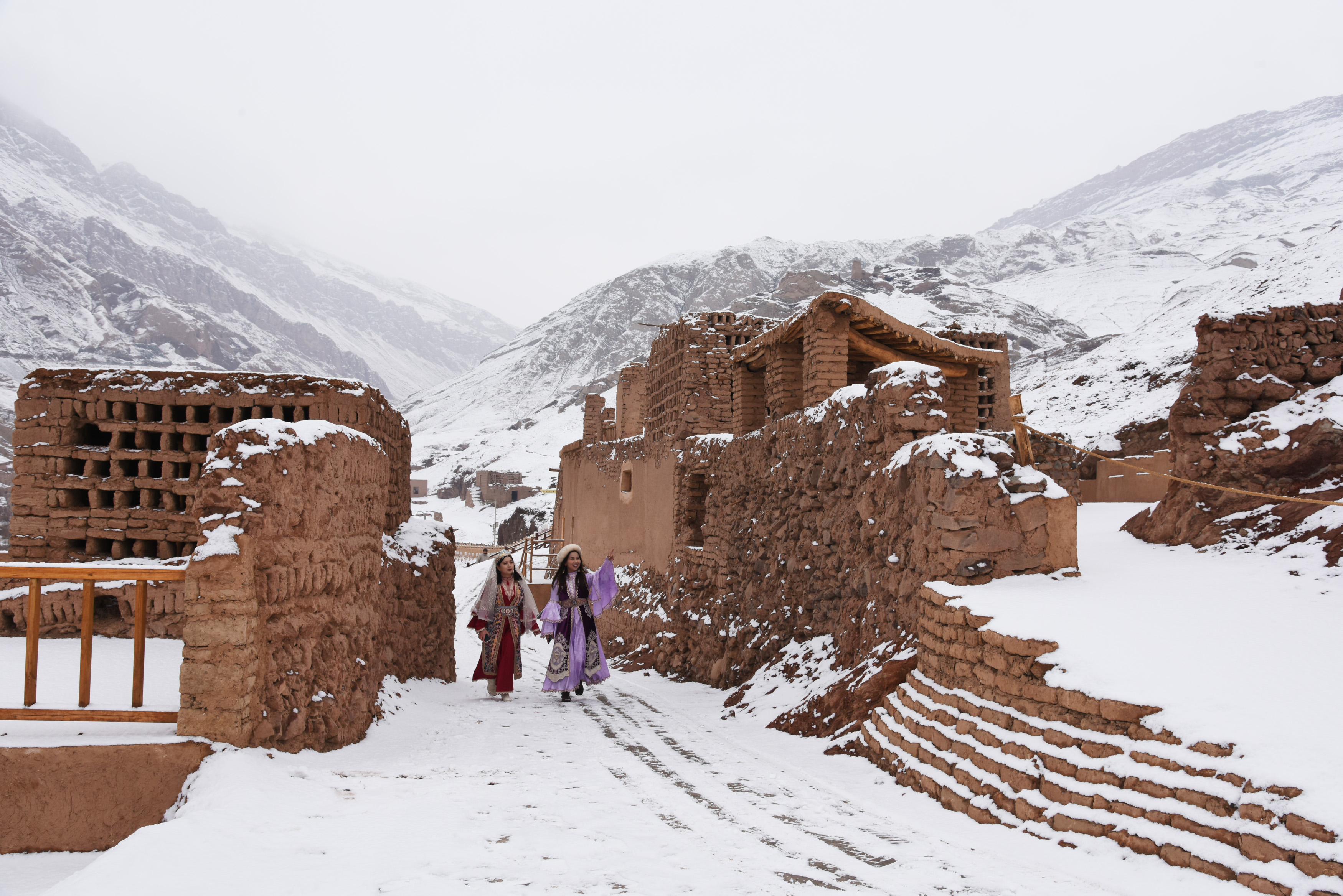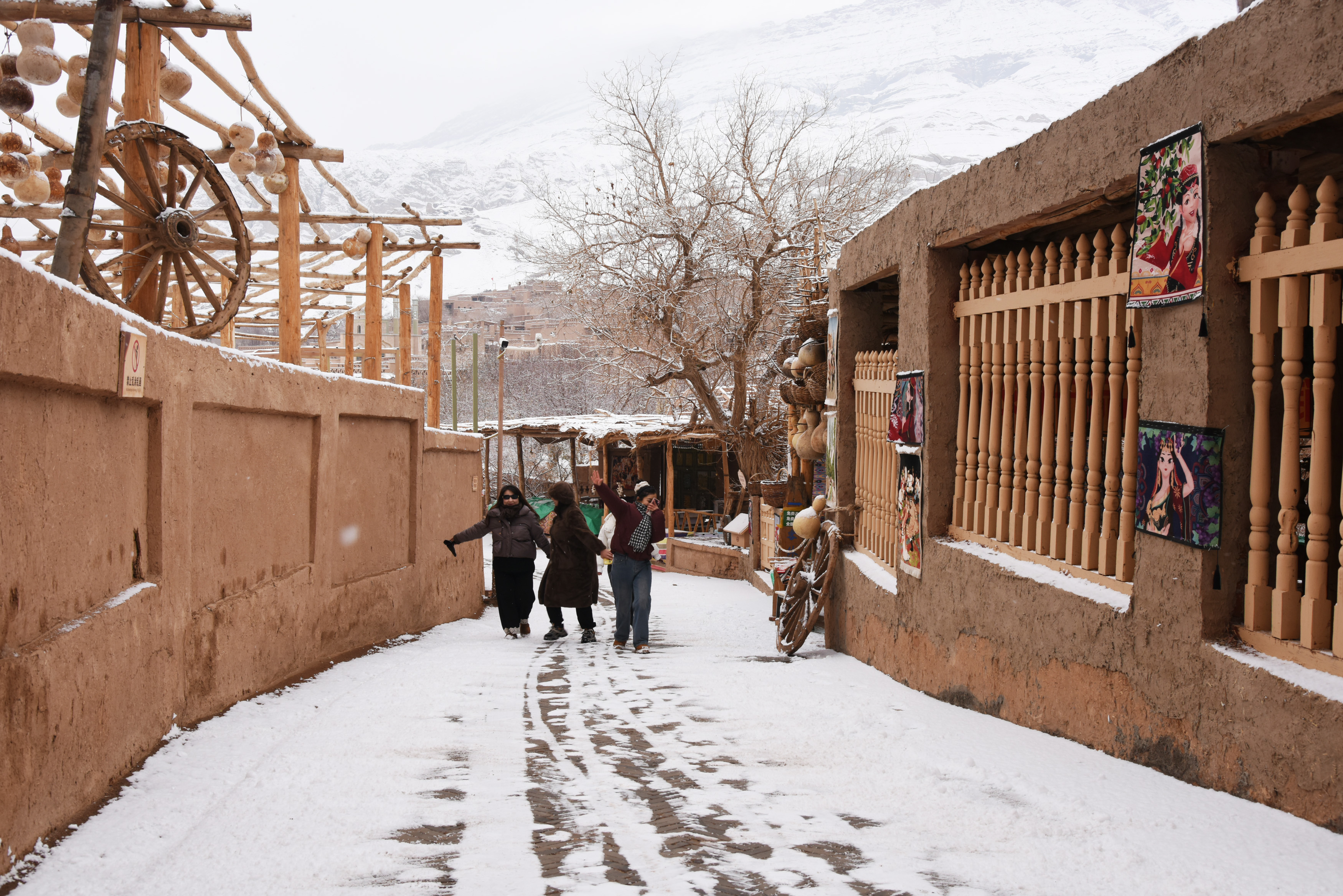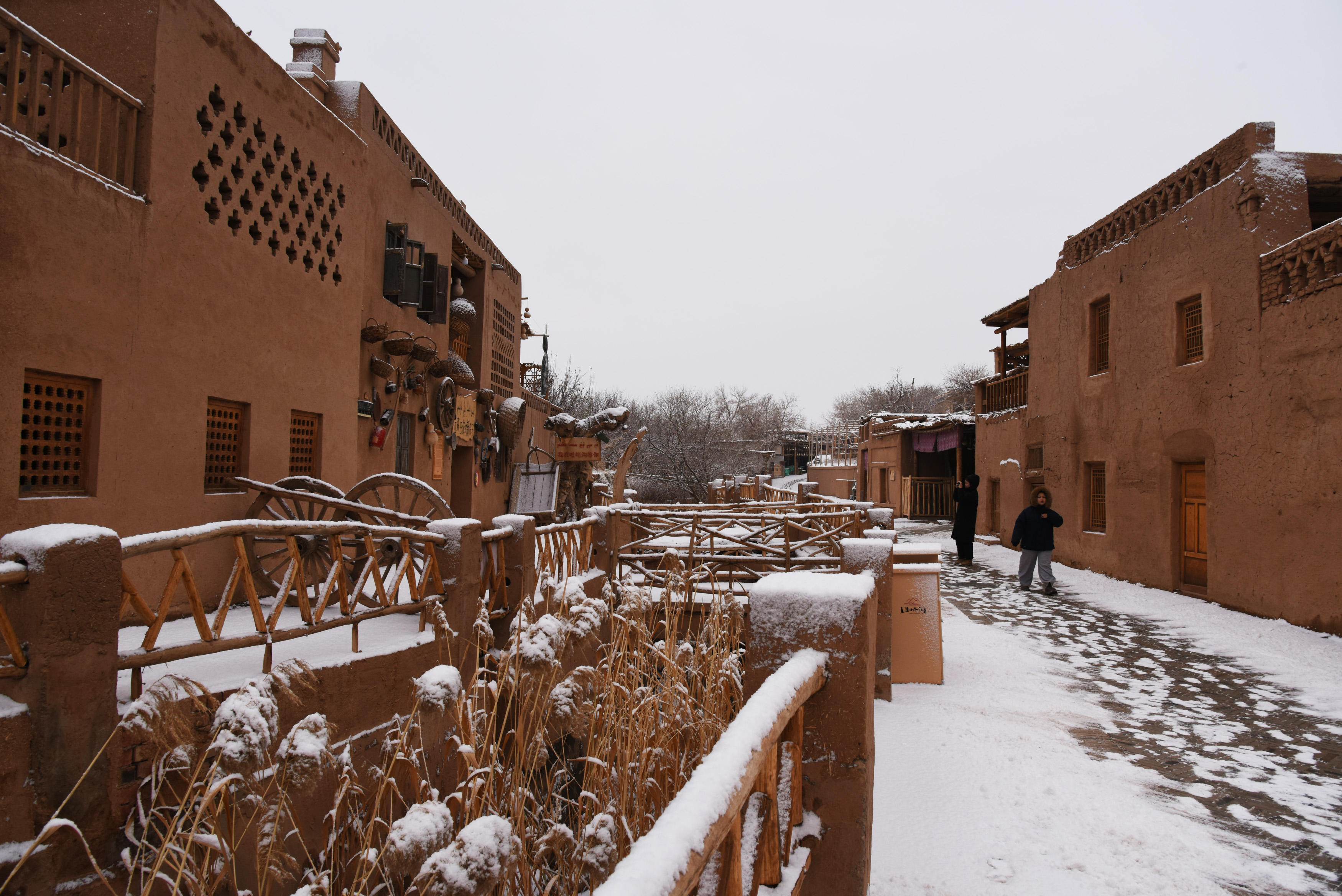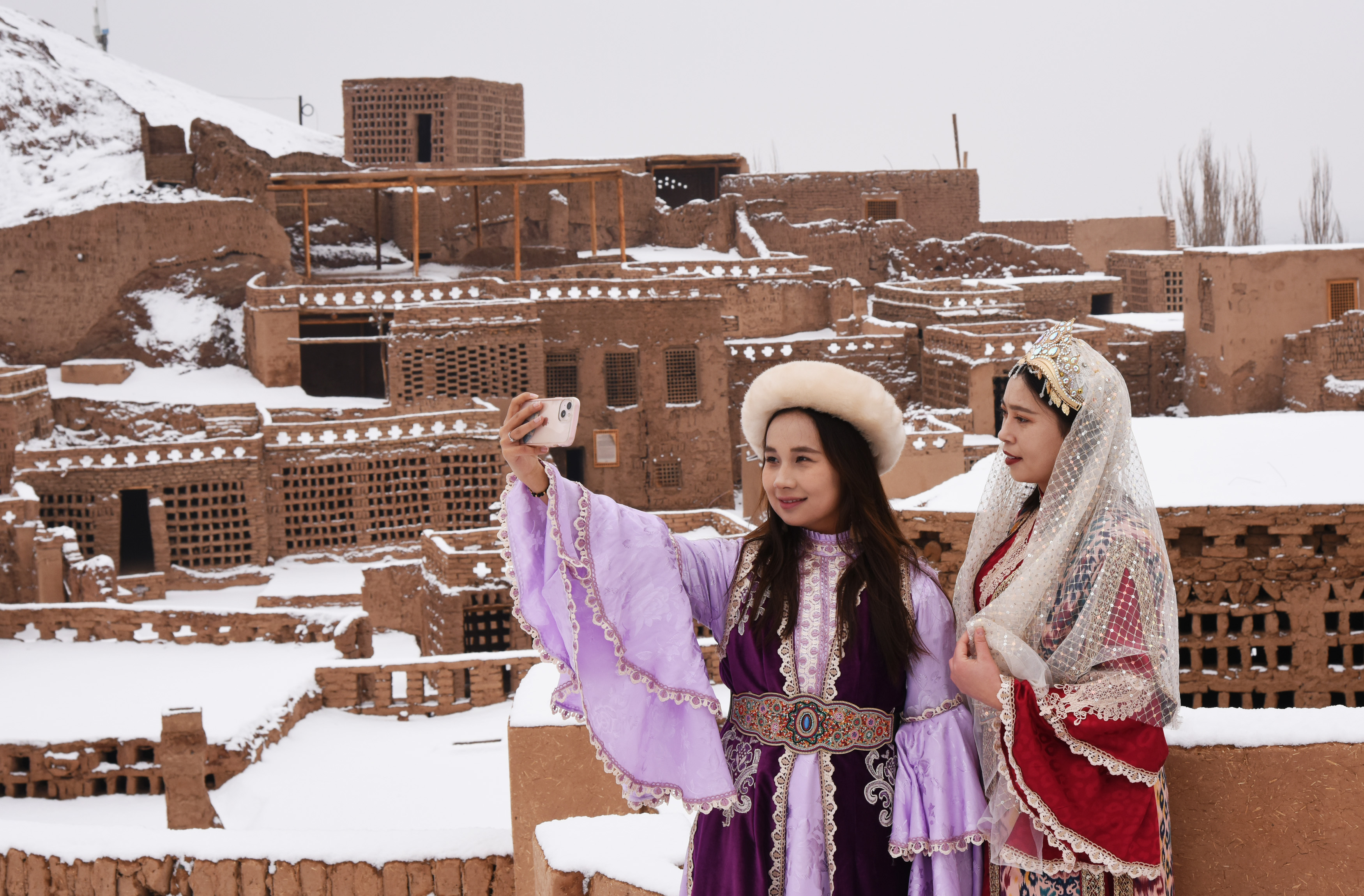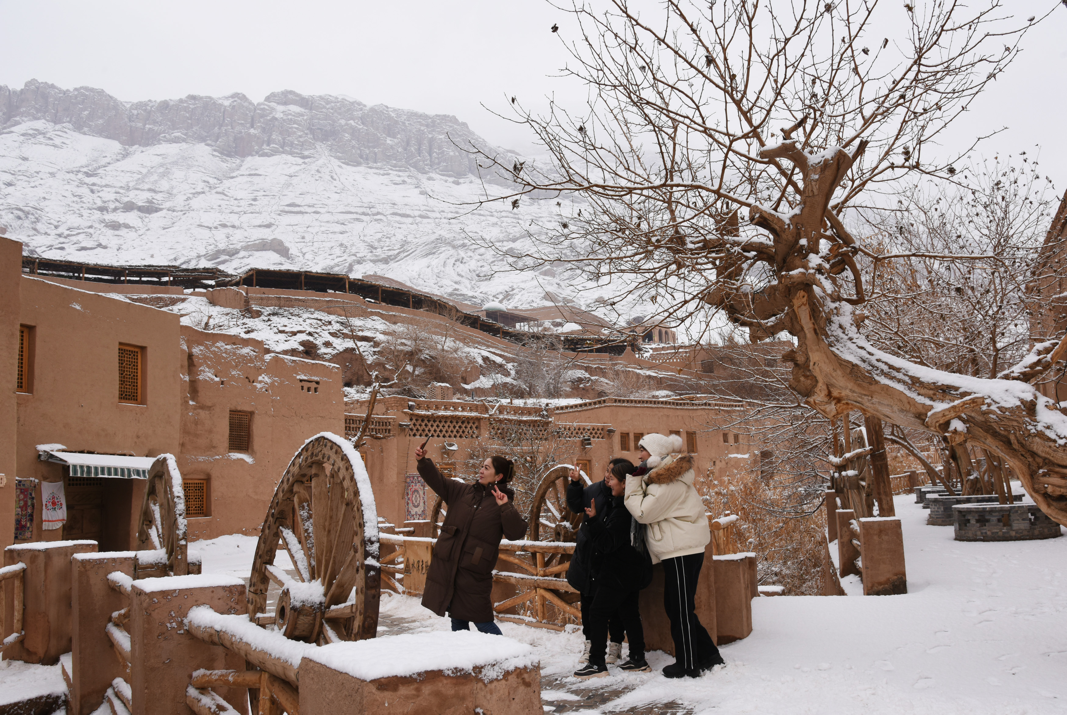 12月11日,吐鲁番火焰山下,游客在落雪后的吐峪沟景区游玩。吐鲁番市融媒体中心记者 刘健 摄