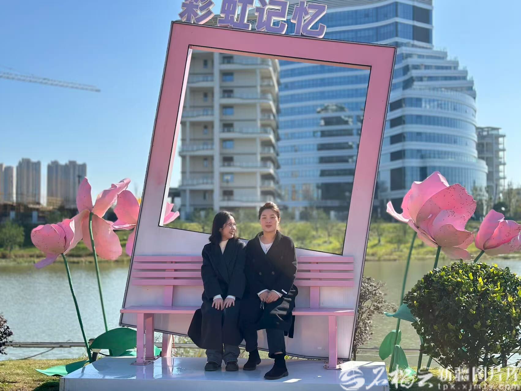 11月26日,下班时间,阿比代·艾合买提(左)和单位同事一起去景区游玩。石榴云/新疆日报记者 马蓓摄