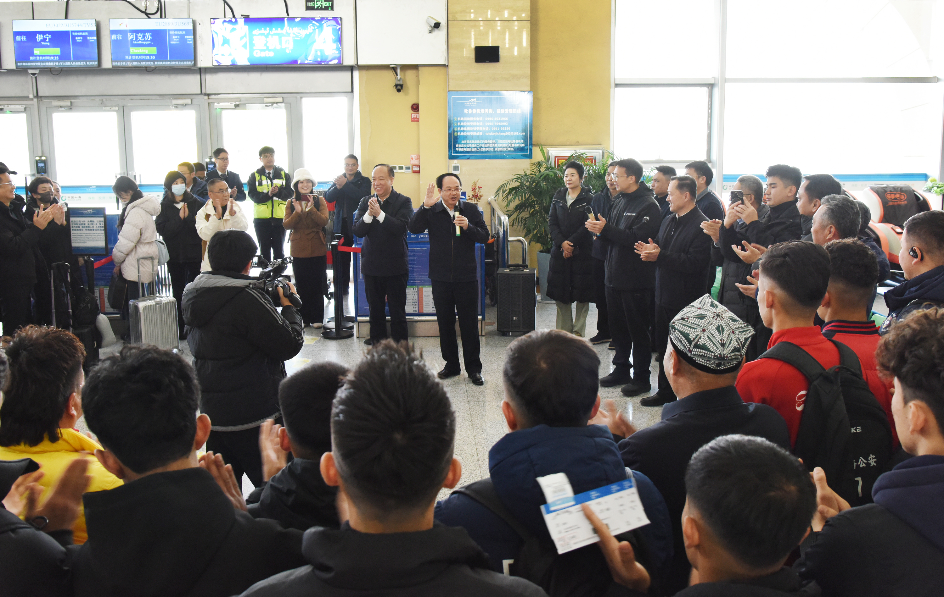 12月19日上午,参加湘超友谊赛的吐鲁番足球队欢送仪式在吐鲁番交河机场举行。图为送行现场。吐鲁番市融媒体中心记者 刘健 摄