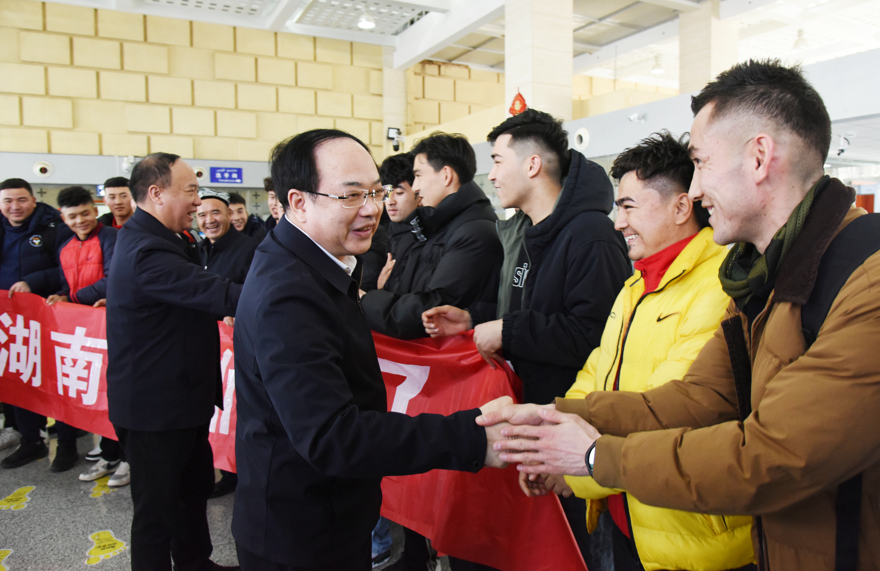 12月19日上午,参加湘超友谊赛的吐鲁番足球队欢送仪式在吐鲁番交河机场举行。图为文天平和队员亲切握手。吐鲁番市融媒体中心记者 刘健 摄