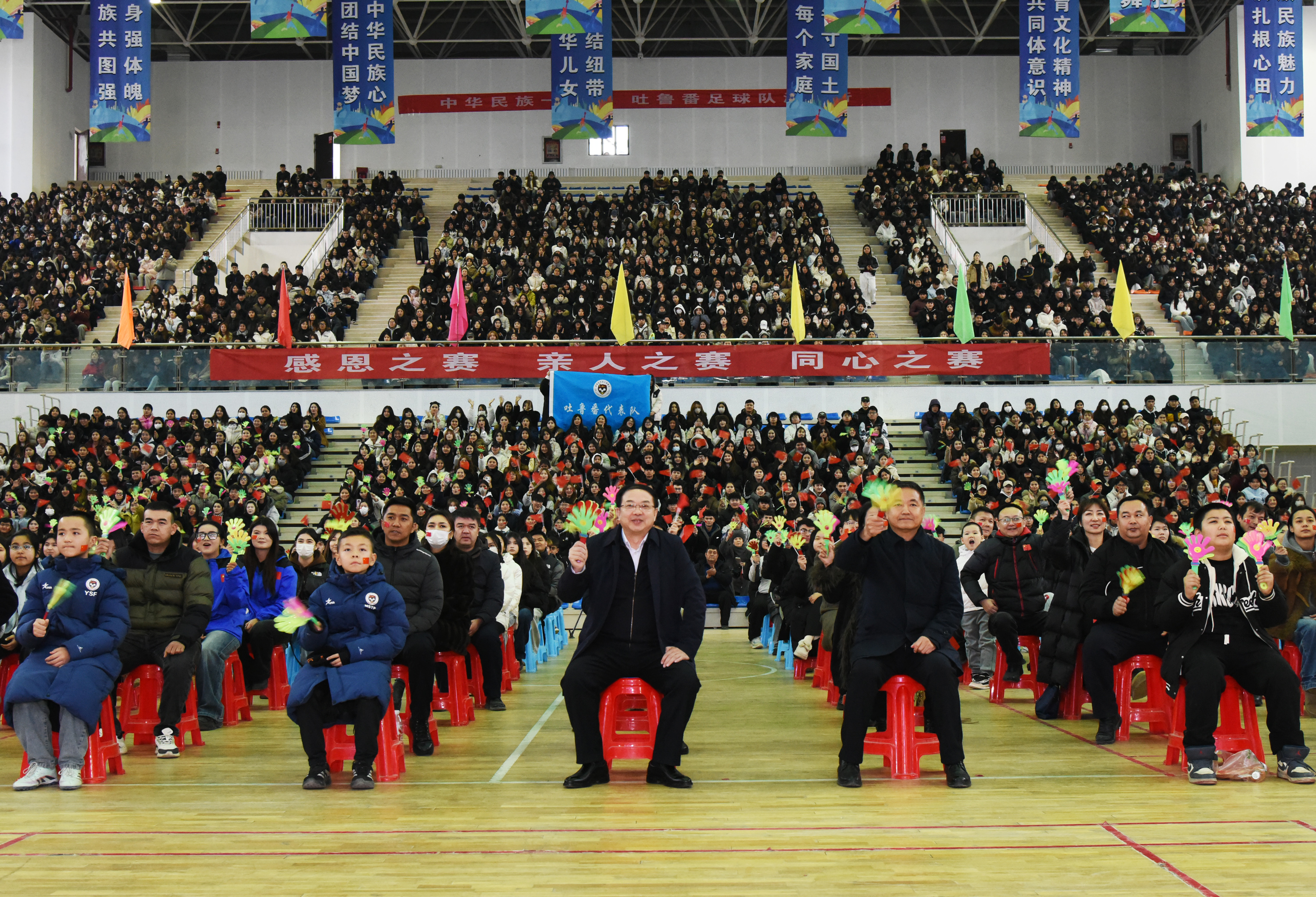 图为市委书记文天平与各单位干部职工代表、球员家属、吐鲁番职业技术学院学生等集中观看直播。吐鲁番市融媒体中心记者 刘健 摄