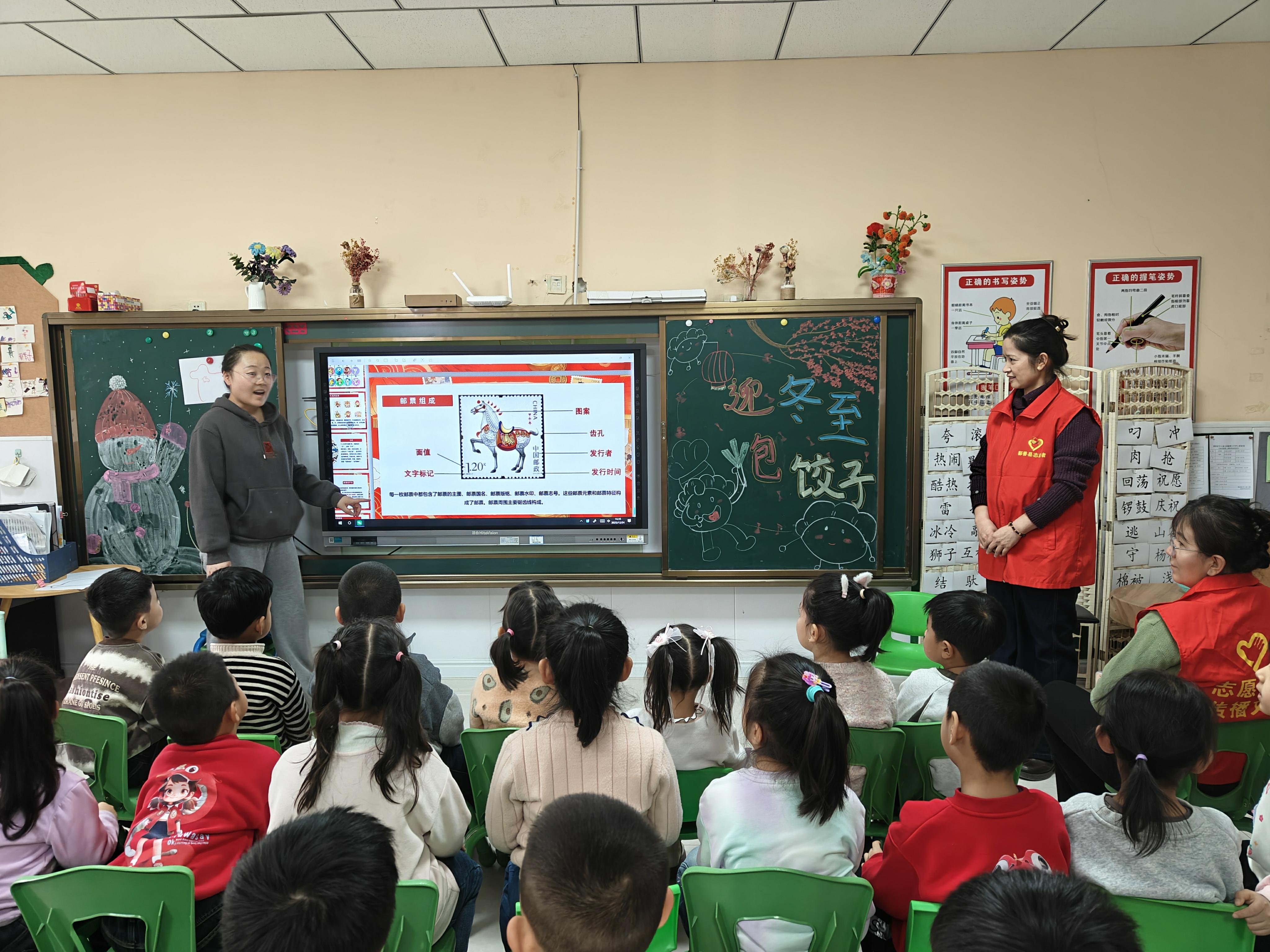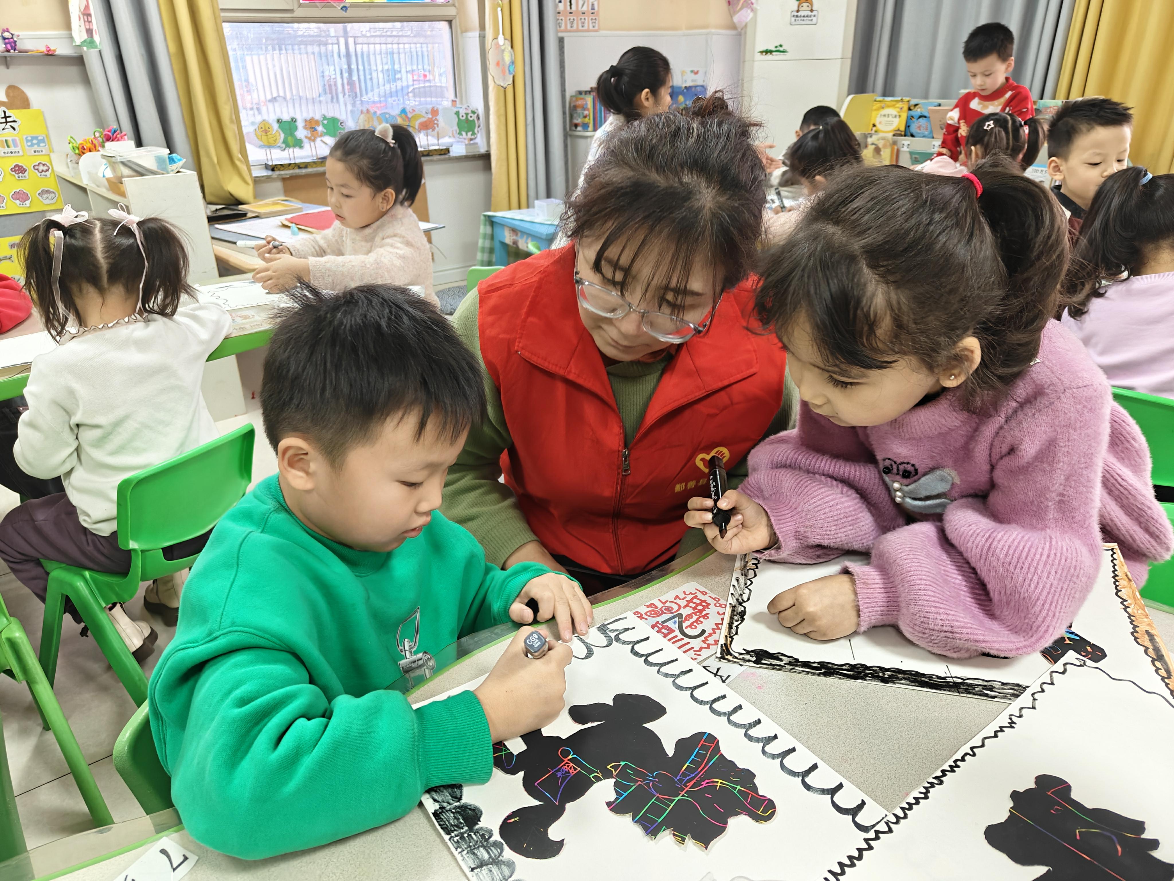 活动现场,社区志愿者与幼儿园教师精心布置创作空间,备齐画笔、画纸与颜料等工具。教师围绕元旦主题,通过趣味讲解启发幼儿想象,引导他们将对新年的期盼、对“村晚”的向往融入画作之中。孩子们兴致勃勃地拿起画笔,勾勒线条、涂绘色彩,红红的灯笼、喜庆的“福”字、热闹的“村晚”舞台等元素跃然纸上,每一幅作品都充满童趣与创意,承载着大家对新年的美好祝福。