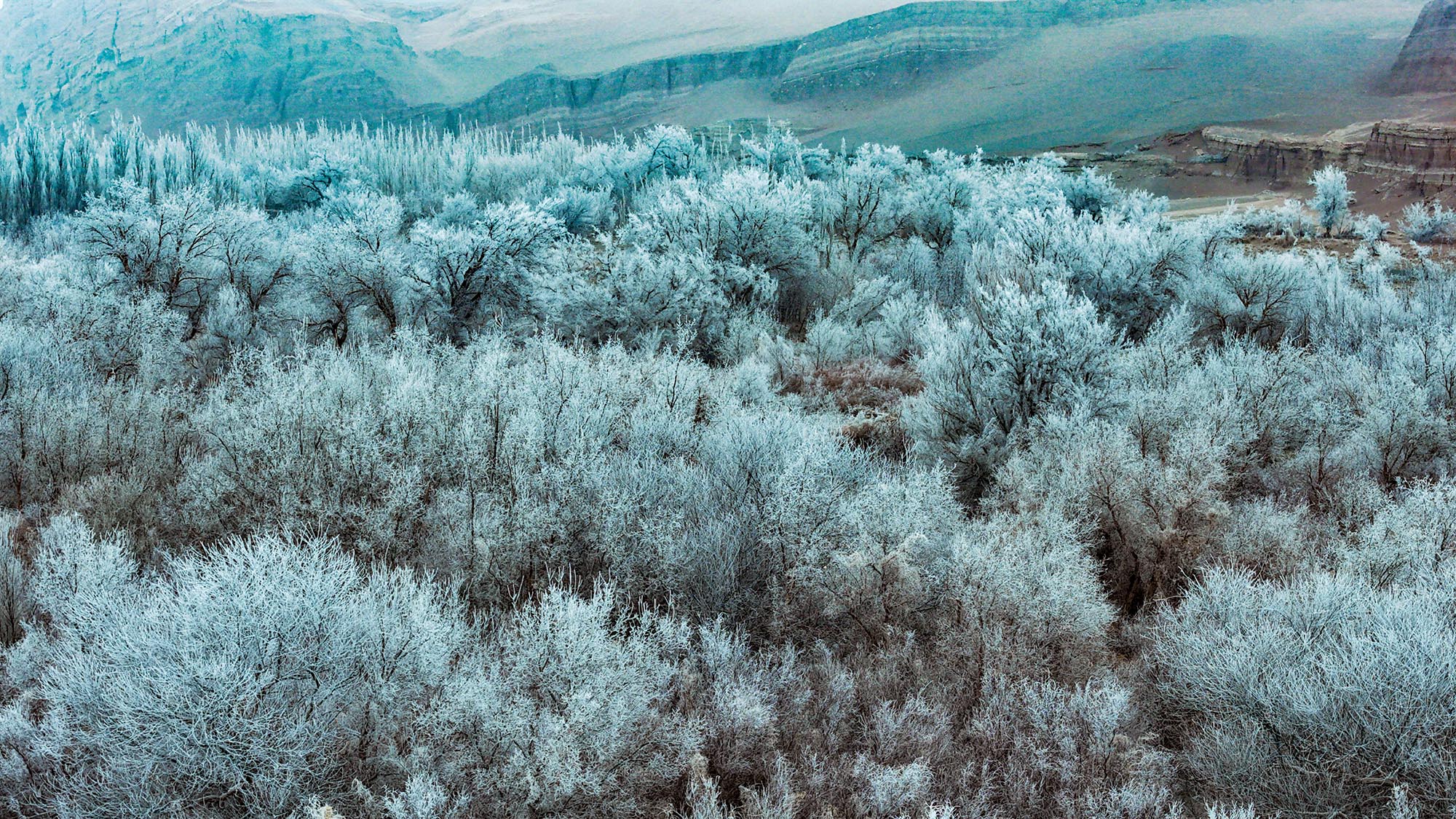 近期,红河谷地区持续低温,充足的水汽在低温条件下凝结,形成大范围雾凇。河谷中的胡杨、红柳等林木银装素裹,宛若玉树琼枝,与岸边红黑相间的岩壁相互映衬,构成温暖与清冷、苍劲与柔美的视觉对比。
