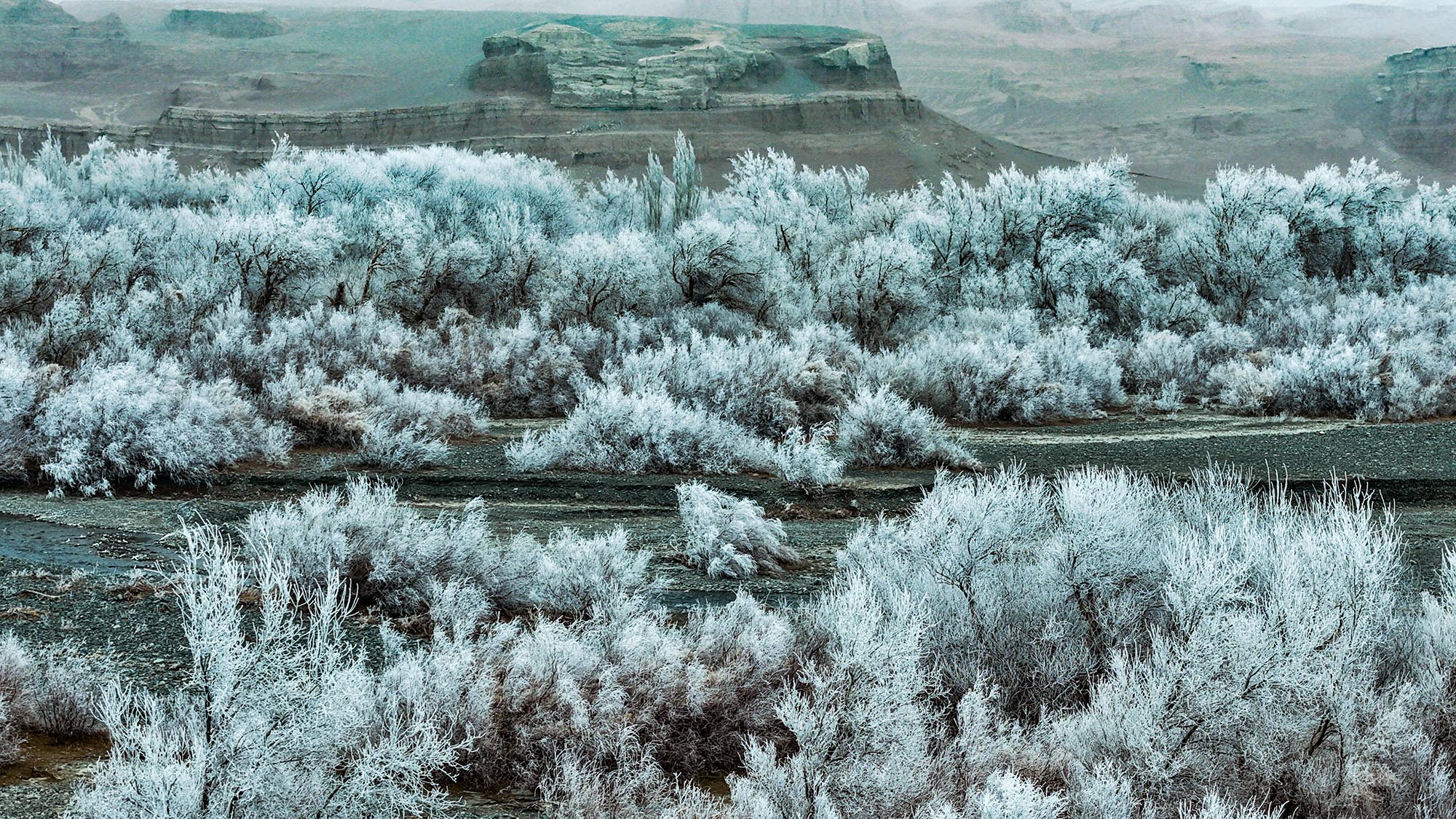 河谷内雾凇景观。