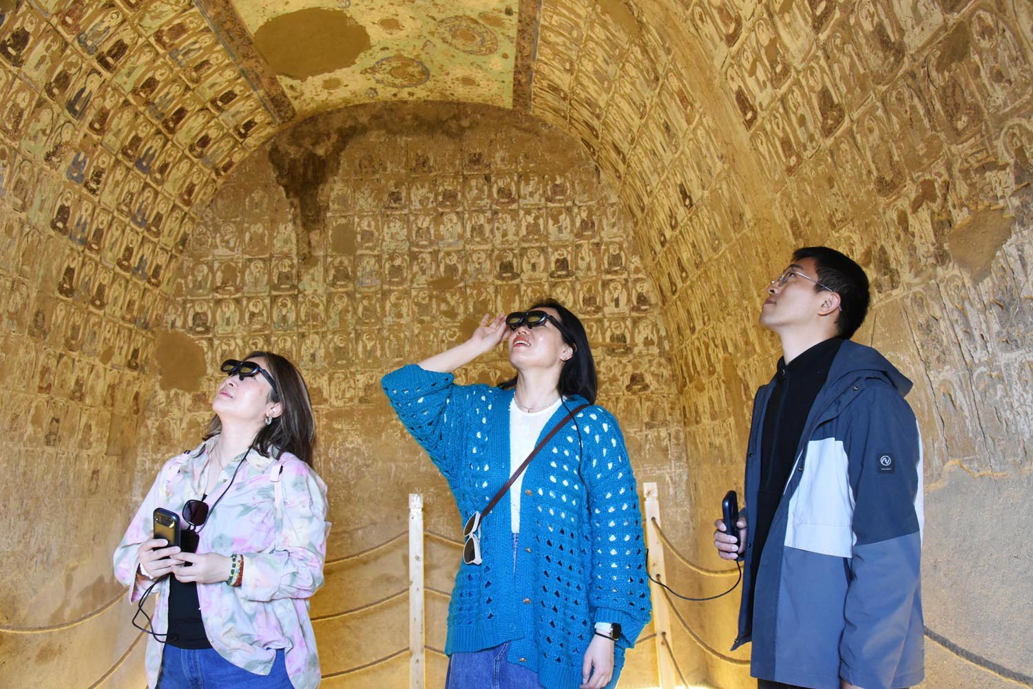 吐鲁番雅尔湖石窟首次开放。图为游客通过AR数字技术观赏石窟内精美的壁画。刘健摄