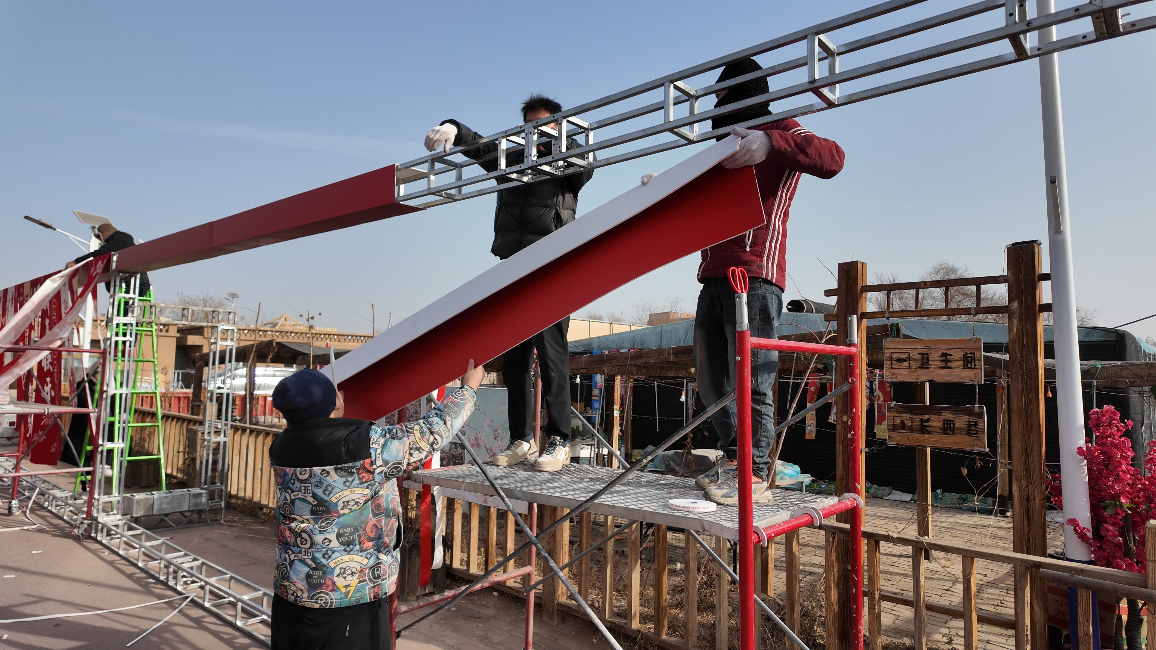 工人紧锣密鼓搭建年货大集。高昌区融媒体中心记者 胡源 摄
