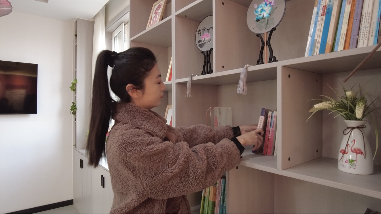 高昌区高昌路街道绿洲社区返乡大学生阿丽亚·吾斯曼正在整理图书。吐鲁番市融媒体中心记者 买迪努尔 摄