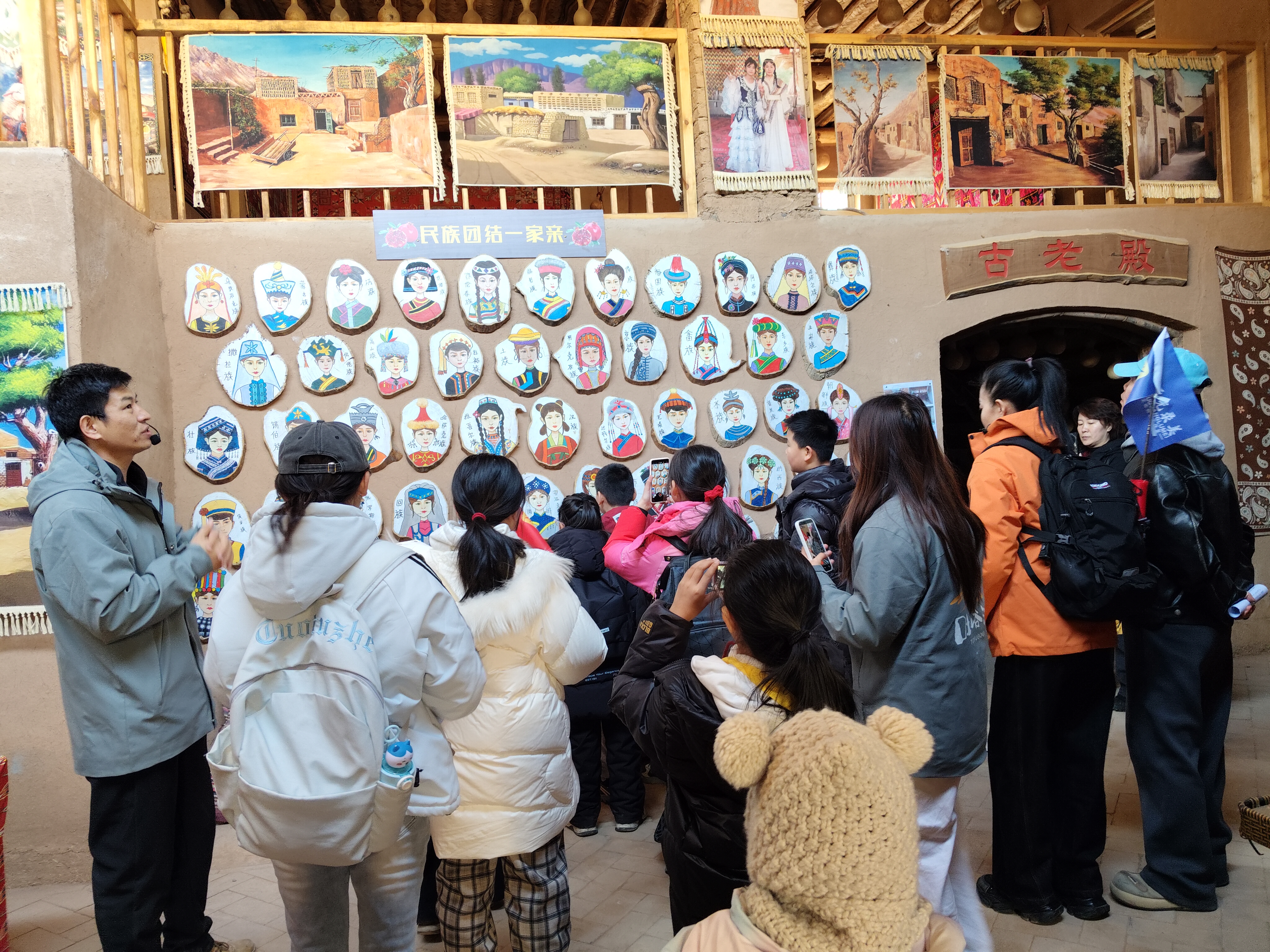 活动中,师生们跟随讲解员深入古村落与石窟遗址,聆听吐峪沟千年变迁,了解生土建筑的生态智慧与石窟艺术的文化内涵。大家认真观察、用心记录,在沉浸式体验中汲取创作养分。其间,师生们还与当地孩子共同开展了趣味“撕名牌”游戏,欢声笑语回荡在古巷之中,为千年村落注入了青春活力。