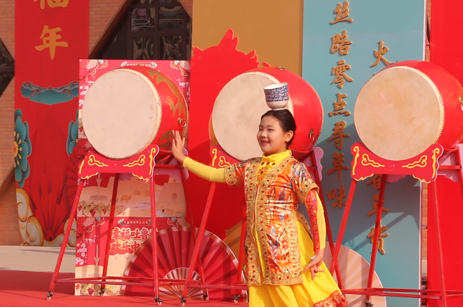 托克逊县第一小学的学生在年货大集现场表演顶碗舞。