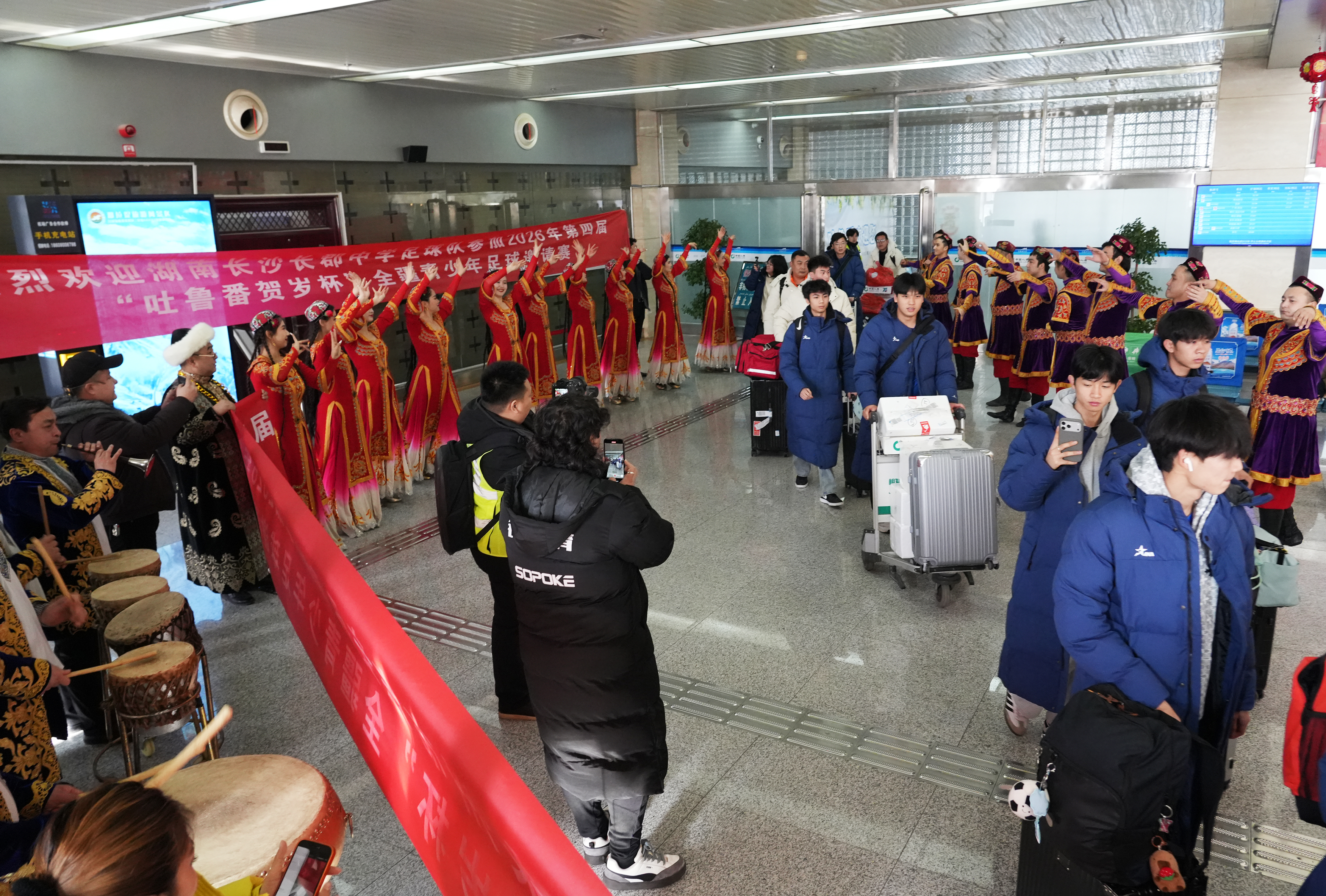 2月2日,吐鲁番交河机场出站口,欢快的歌舞轮番上演,我市群众热情迎接湖南省永州市东安县代表队、长沙长郡中学代表队球员。这两支队伍将与祁阳市足球代表队、湖南湘成足球俱乐部代表队一道,参加本次“贺岁杯”足球赛。