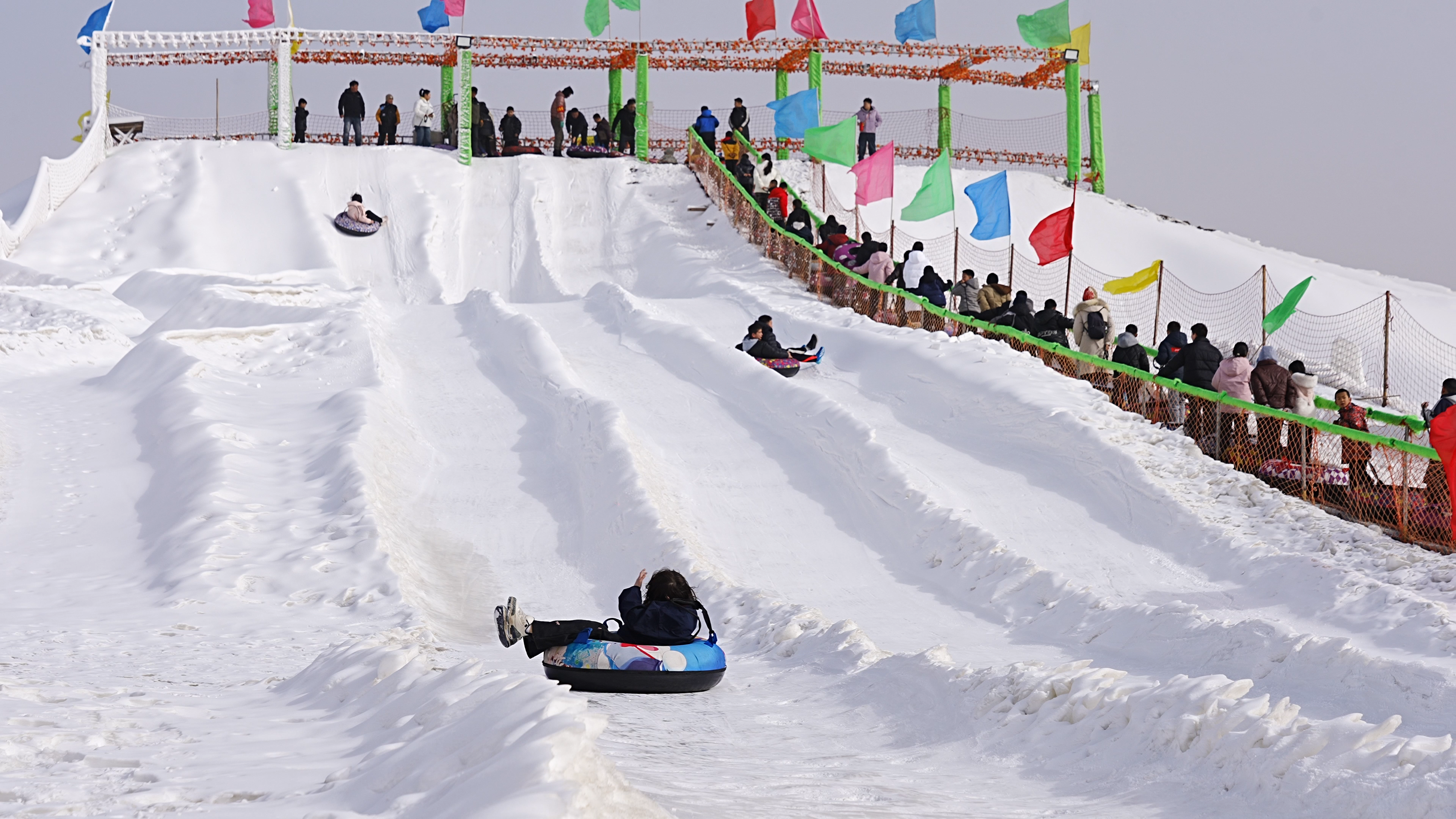 游客体验雪圈俯冲项目