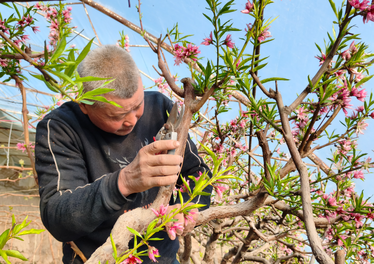 2月9日,记者走进该村种植大户王天山的温室大棚,只见他正手持剪刀,娴熟地进行疏花、授粉等精细管护工作。拥有20多年大棚种植经验的王天山告诉记者,花期是桃树生长和果实品质形成的关键时期,必须精确调控棚内温度、湿度和光照,才能确保桃子个头大、口感甜。这些天,他每天早早便开始忙碌。“今年,我家的7座大棚均套种了桃树和葡萄,预计亩产桃子和葡萄1至1.5吨,亩均收入超过2万元。”王天山高兴地说。