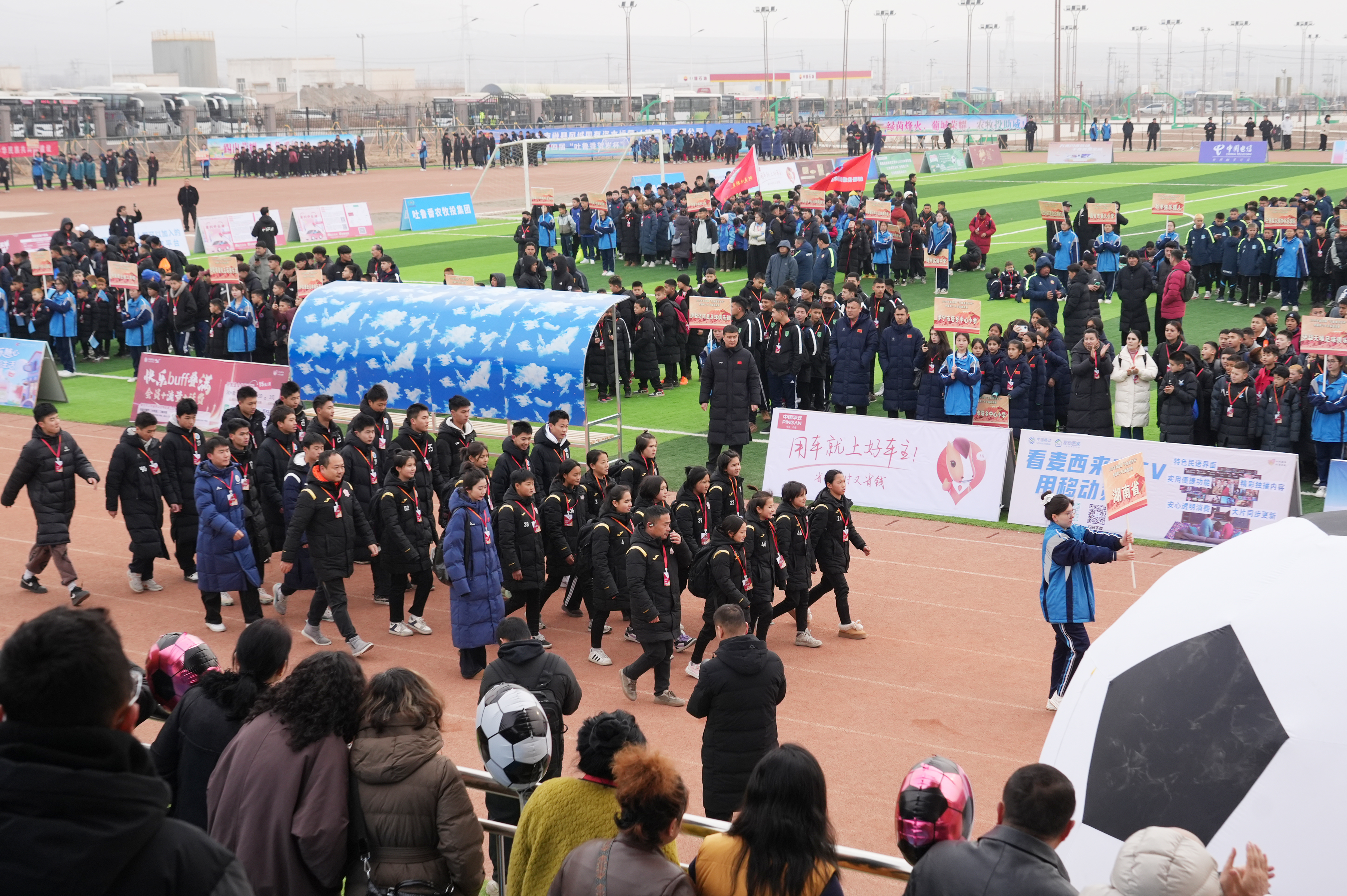 第四届“吐鲁番贺岁杯”全疆青少年足球邀请赛开幕式上,湖南湘成足球俱乐部代表队入场。 吐鲁番市融媒体中心记者 刘字昂 摄