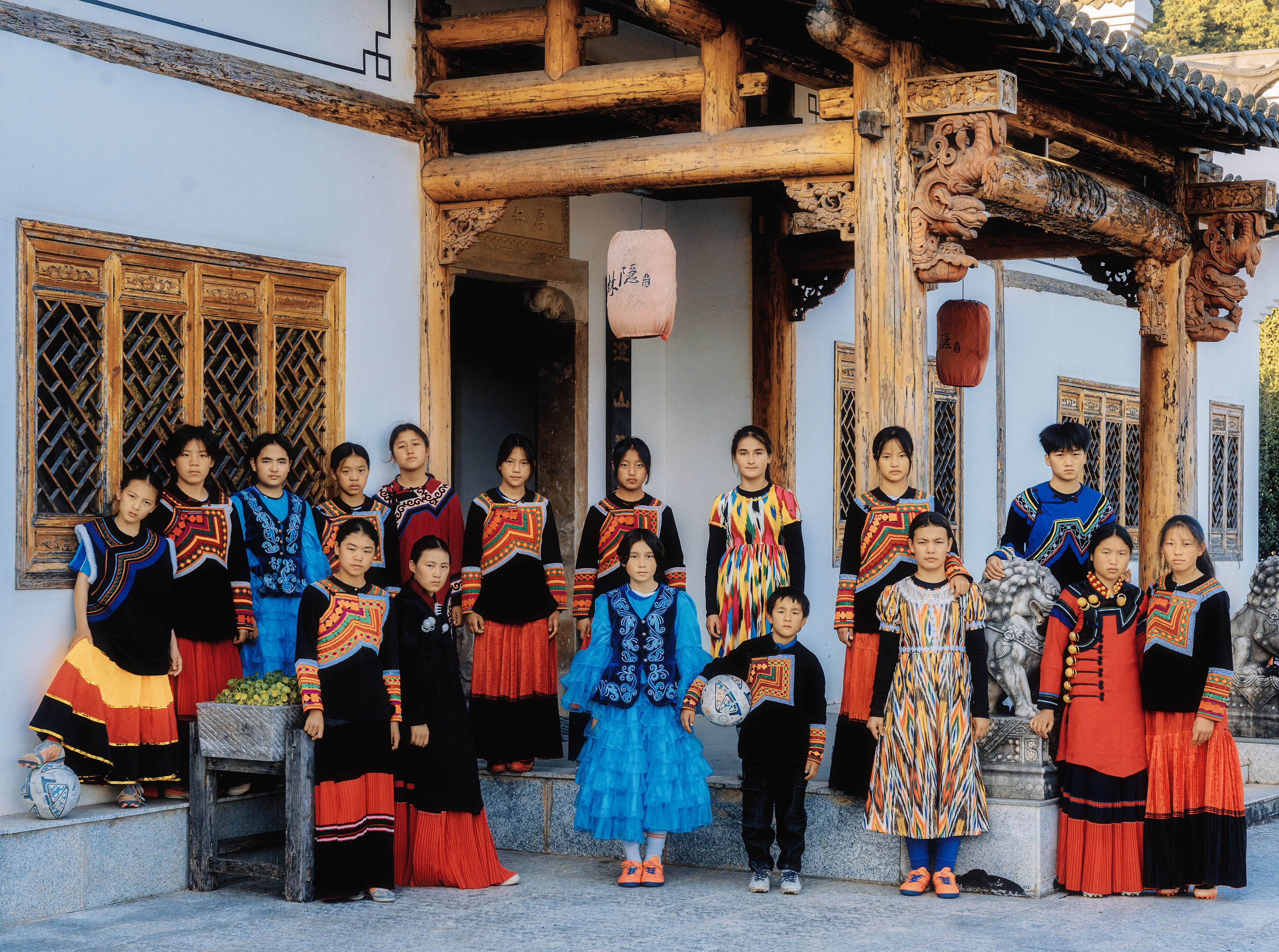 湖南湘成足球俱乐部的孩子们身穿民族服饰合影。(湖南湘成足球俱乐部供图)