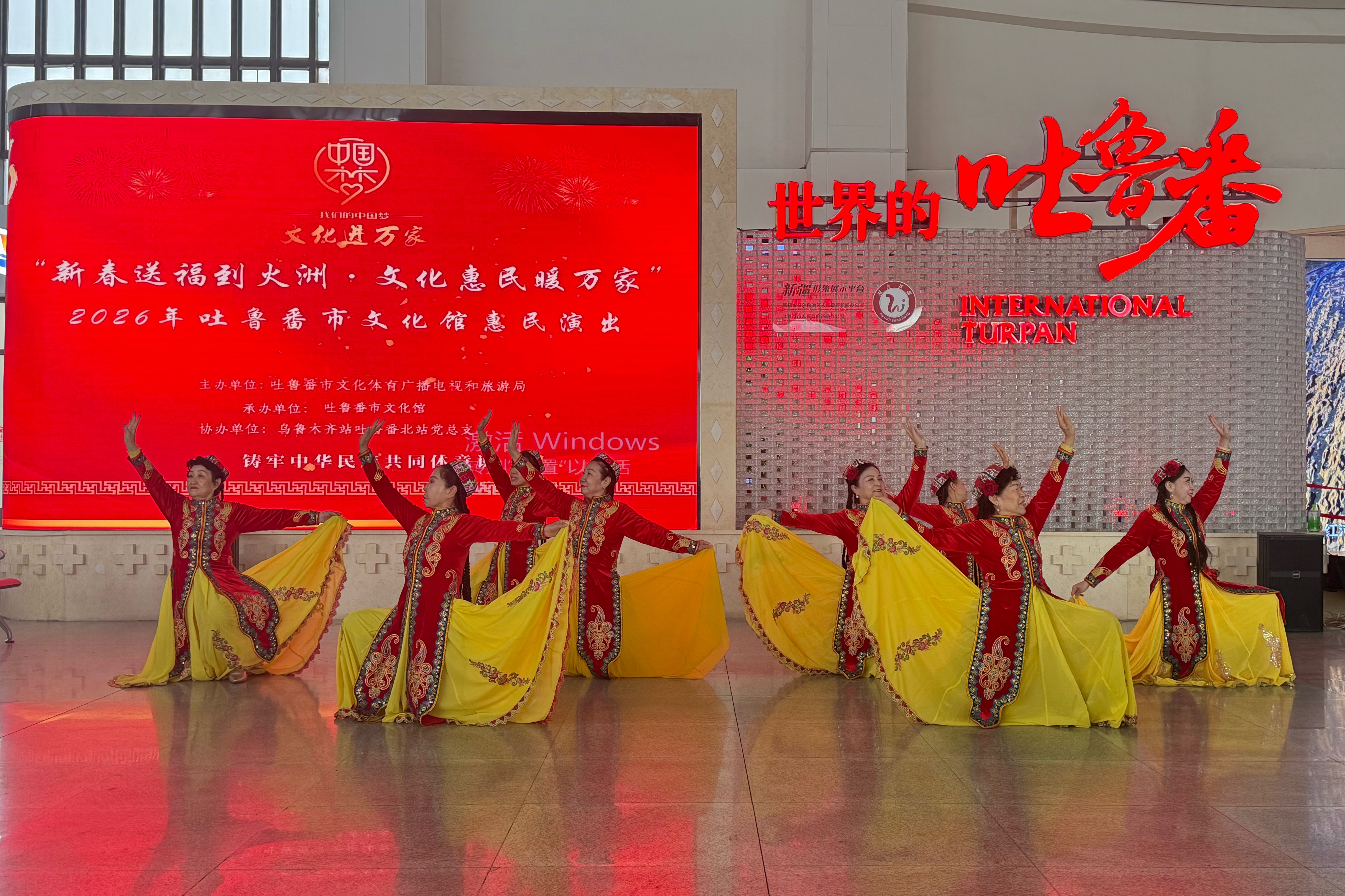 吐鲁番市融媒体中心讯(文/图 通讯员 朱宇航)2月10日,由市文旅局主办、市文化馆承办的“新春送福到火洲·文化惠民暖万家” 惠民演出活动走进吐鲁番北站,为候车旅客送来一场兼具民俗韵味与地域特色的文化盛宴,让这段旅途充满温情与暖意。