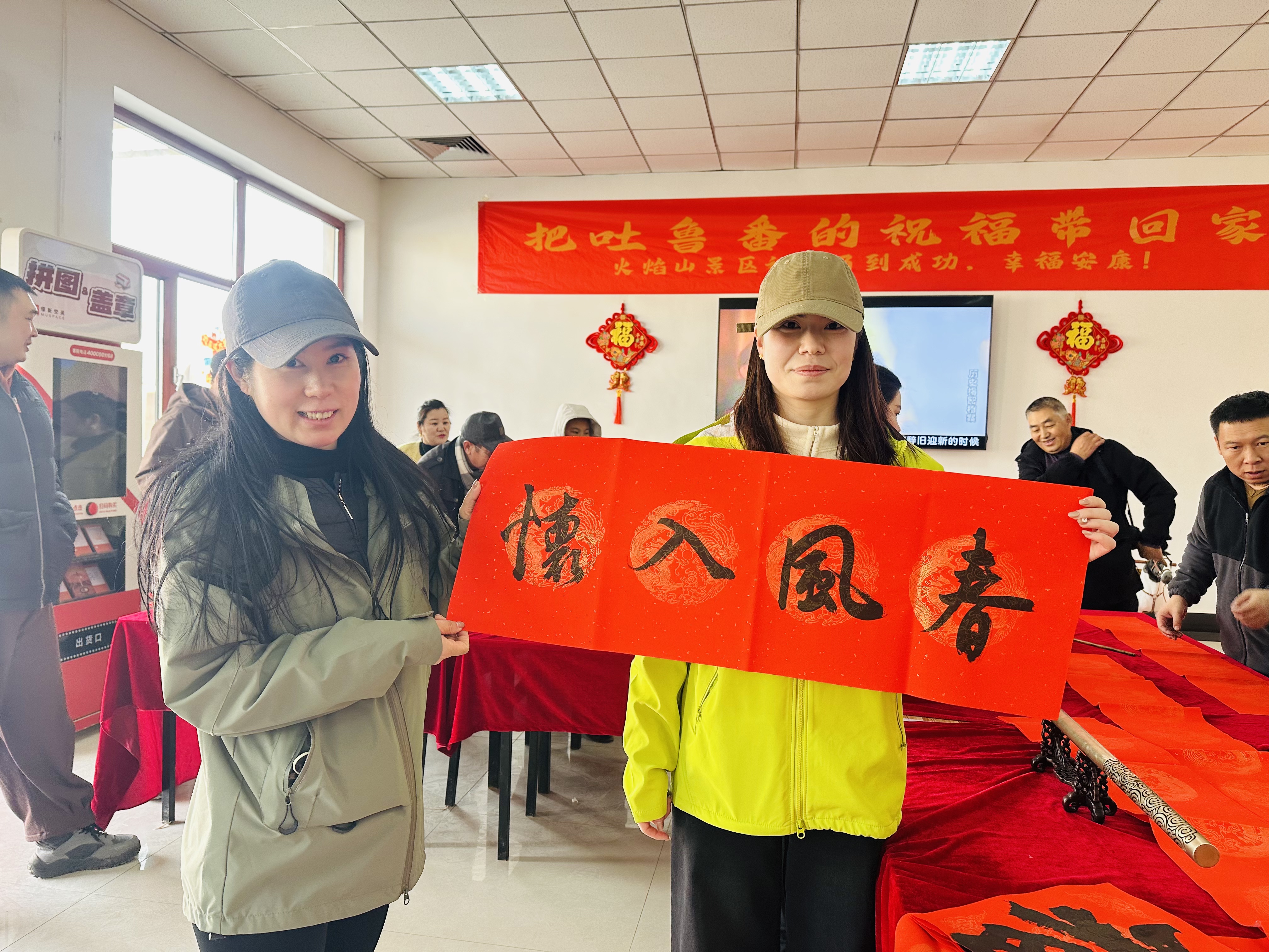 “没想到在火焰山还能收到手写的春联和福字,这份祝福太有心了!”来自安徽的游客石瑞一家围在桌前,将刚晾干的福字小心收好。她笑着说,这趟旅途因这份“笔墨传情”而格外温馨,成为难忘的新春记忆。