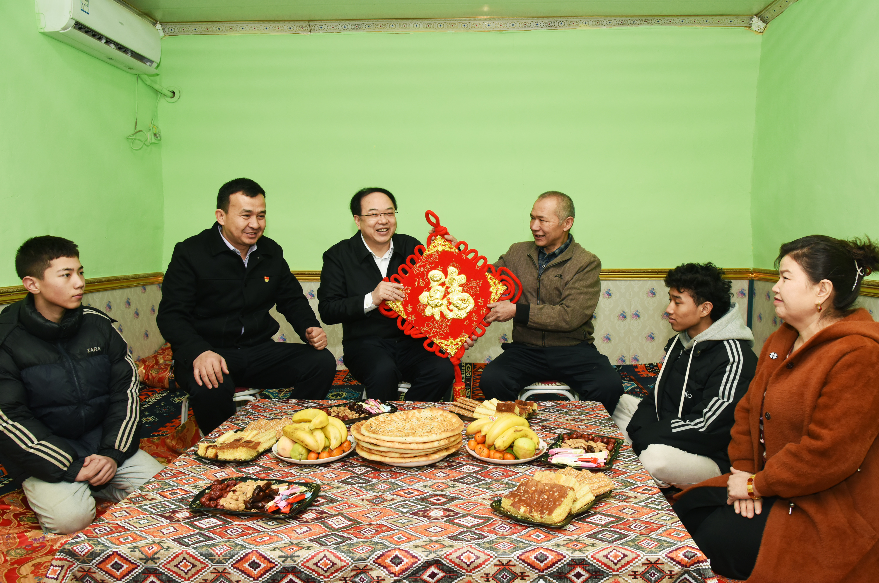 2月13日,市委书记文天平深入一线调研安全稳定看望慰问基层干部群众。图为文天平在英买里村与村民巴热·乃买提一家围坐在一起拉家常、谈思路、话团结。吐鲁番市融媒体中心记者 刘健 摄