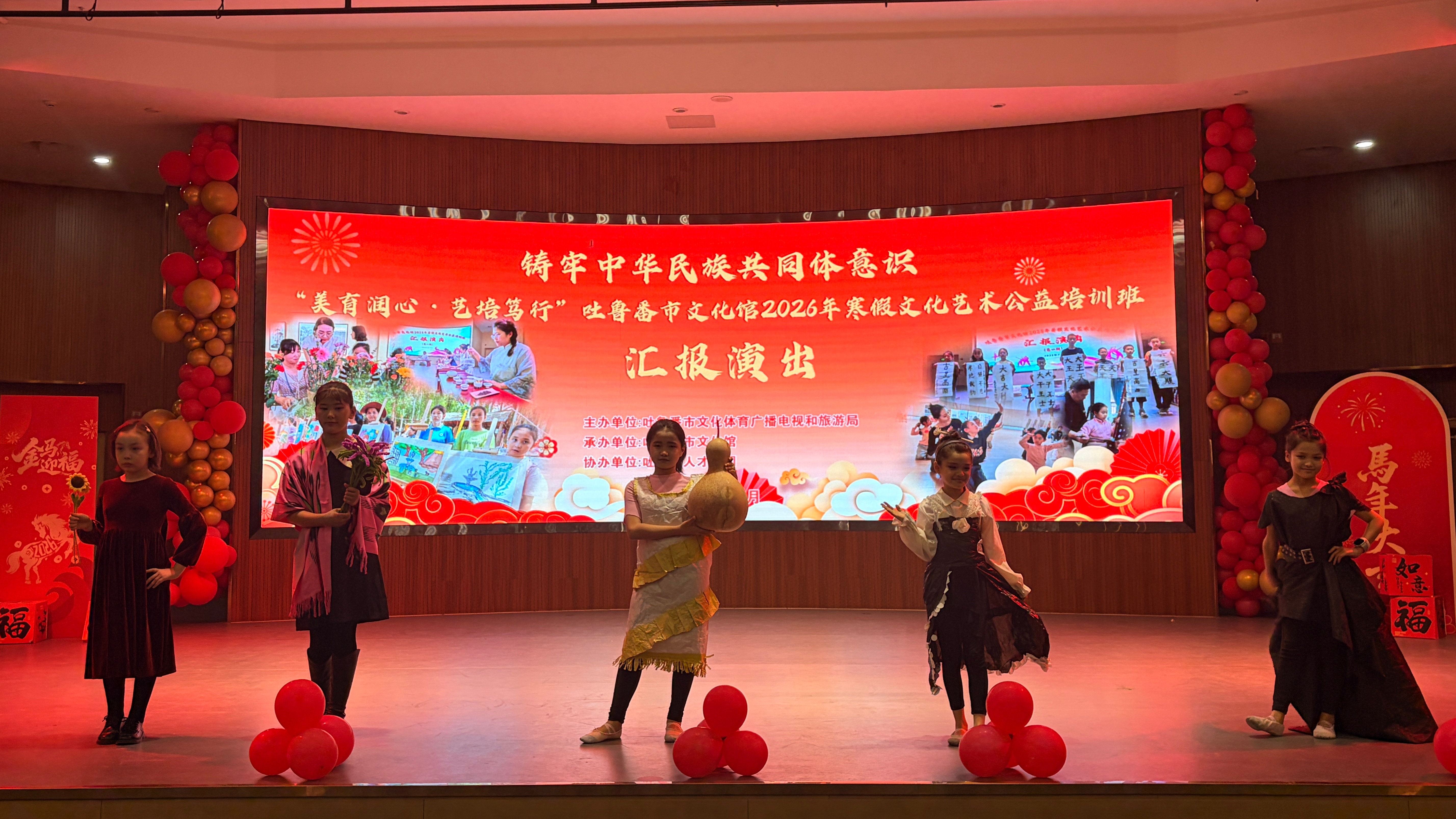 吐鲁番市融媒体中心讯(文/图 记者 阿丽亚)2月14日,吐鲁番市举办2026年寒假文化艺术公益培训班汇报演出。各族青少年学员登上舞台,集中展示了舞蹈、书画等寒假期间所学的艺术成果,为充实而有意义的假期画上圆满句号。
