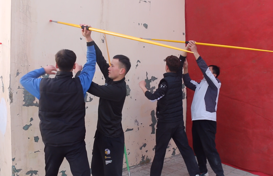 托克逊县第二中学体育老师在纠正学生们握竹枪姿势以及力度。