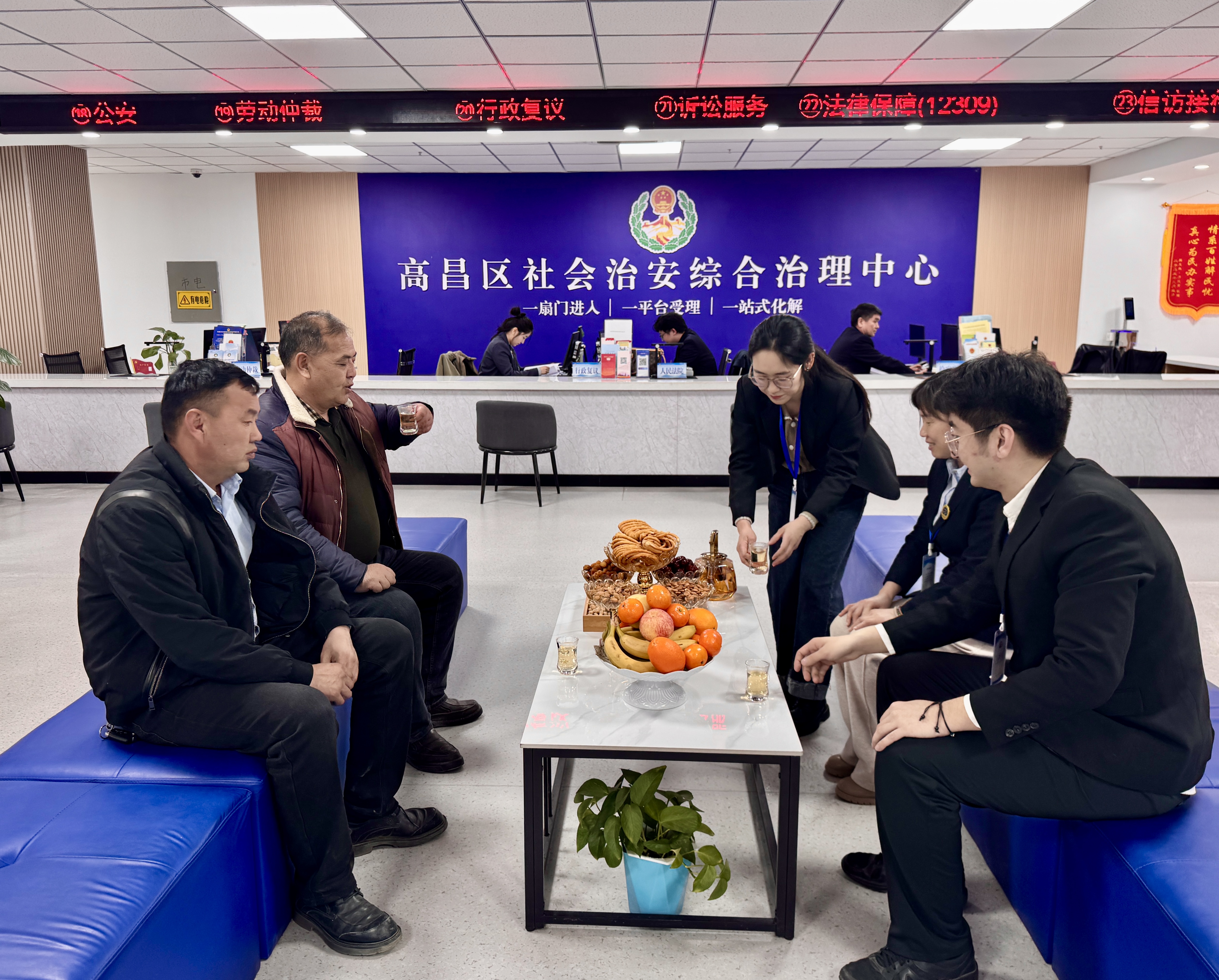递上的一杯热茶,是化解对立的第一道桥梁。2025年12月31日,许某某等4名务工人员焦急地来到高昌区综治中心,反映在某铁矿项目工地被拖欠工资34400元,返乡心切的他们情绪激动。工作人员没有急于询问案情,而是先递上一杯热茶,耐心安抚。待工人情绪平复后,才细致了解事情原委,并立即联动劳动监察窗口快速处置。当日下午,企业便将全额工资发放到位。“在接待群众时,从一杯热茶、一句问候做起,让群众放下顾虑、打开话匣,是快速掌握诉求、实现早介入的关键。”高昌区委政法委常务副书记赵春华这样阐释递茶问需的内涵。