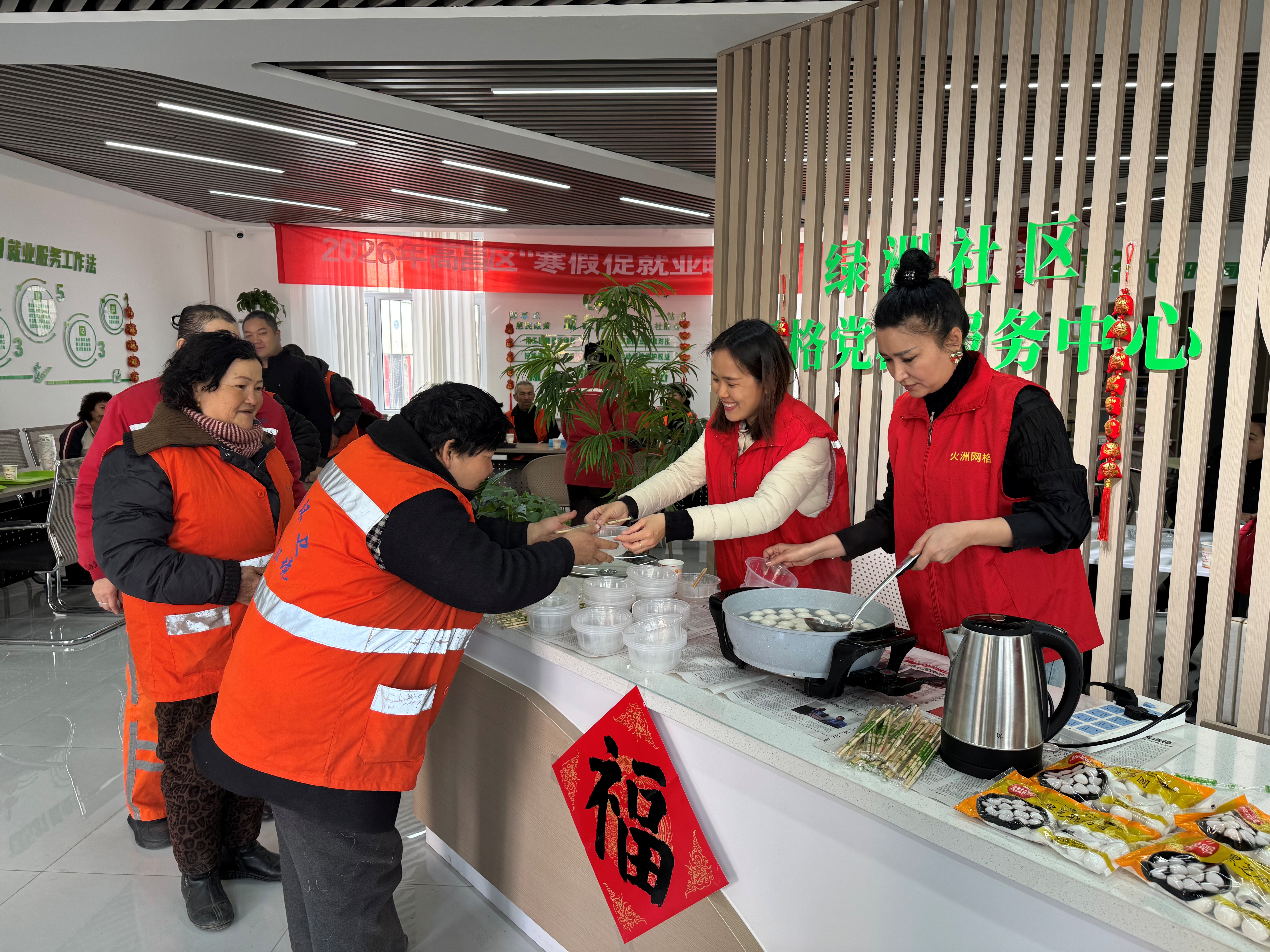高昌区高昌路街道绿洲社区工作人员与志愿者将热气腾腾的汤圆送到环卫工人及快递员手里。