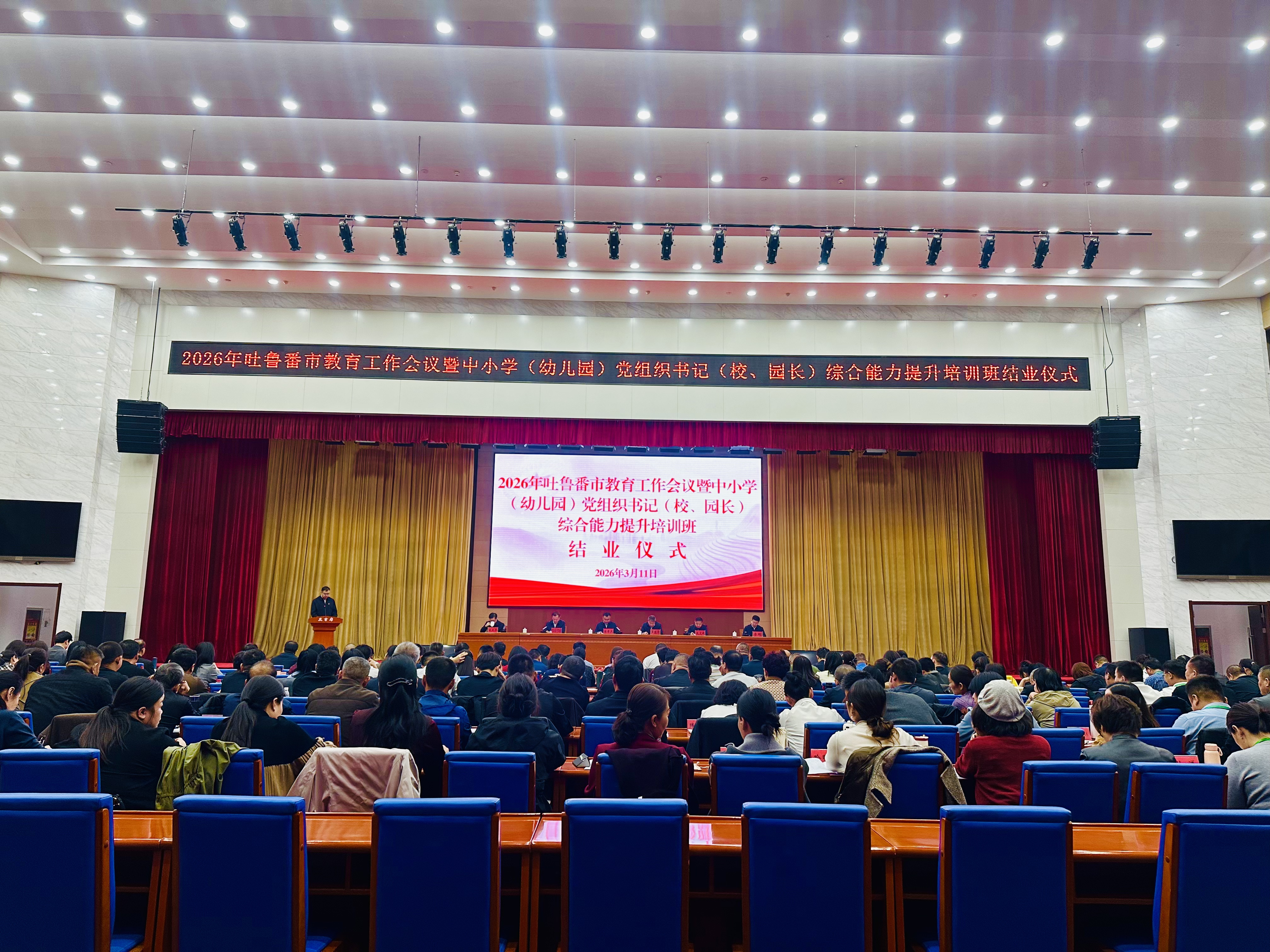 吐鲁番市融媒体中心讯(记者 阿地兰 艾尼娃)3月11日下午,2026年吐鲁番市教育工作会议暨中小学(幼儿园)党组织书记(校、园长)综合能力提升培训班结业仪式在市委党校举行。市委副书记、教育工委书记、湖南省援疆前方指挥部指挥长陈章杰,湖南省援疆前方指挥部副指挥长罗国宇出席会议。副市长阿不力米提·阿不力孜主持会议。