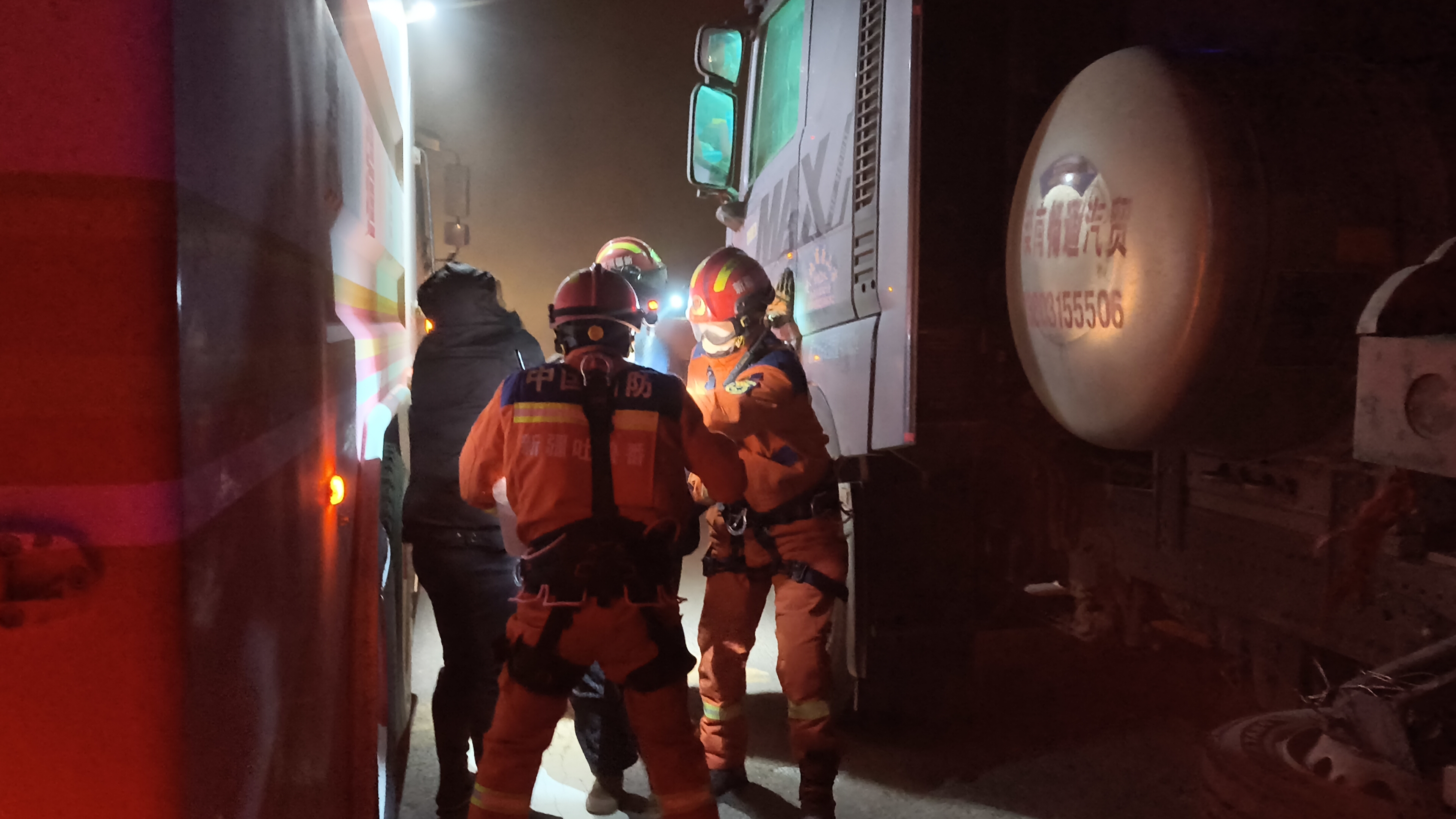 当天21时12分,吐鲁番市消防救援支队接到报警,称在艾丁湖镇附近有人员因大风被困车中。救援人员顶着狂风沙尘,在能见度极低的情况下艰难搜寻。23时16分,消防员首先发现一辆被困半挂车,将车内一对情绪紧张的夫妻安全转移。随后,救援队伍继续扩大搜索,于23时45分找到另一辆被困车辆,并救出第三名驾驶员。在确认现场无其他被困人员后,消防员将三人安全护送至市区酒店安置。