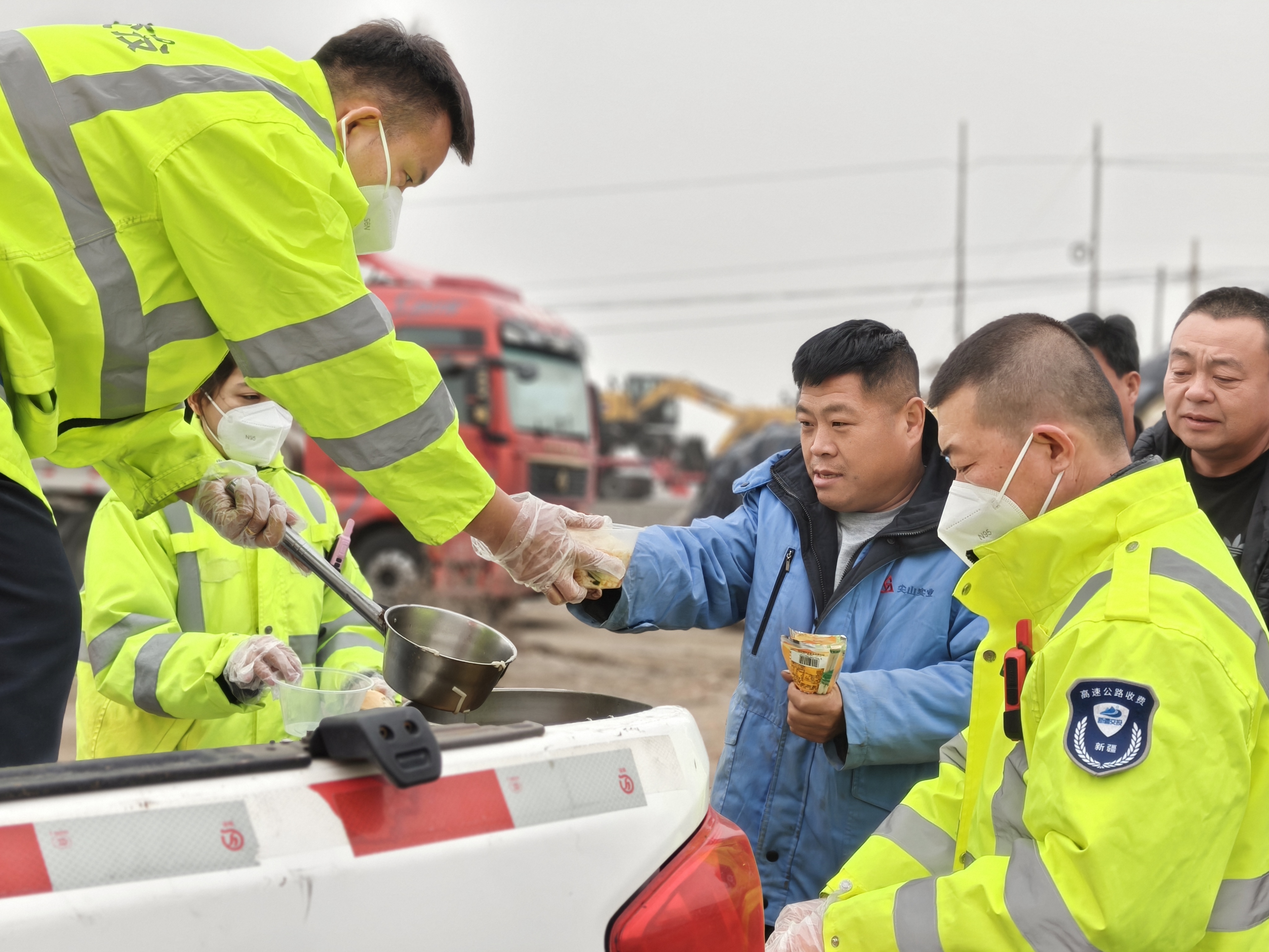 新疆交投集团吐鲁番分公司工作人员向滞留人员提供汤饭、榨菜等食物。