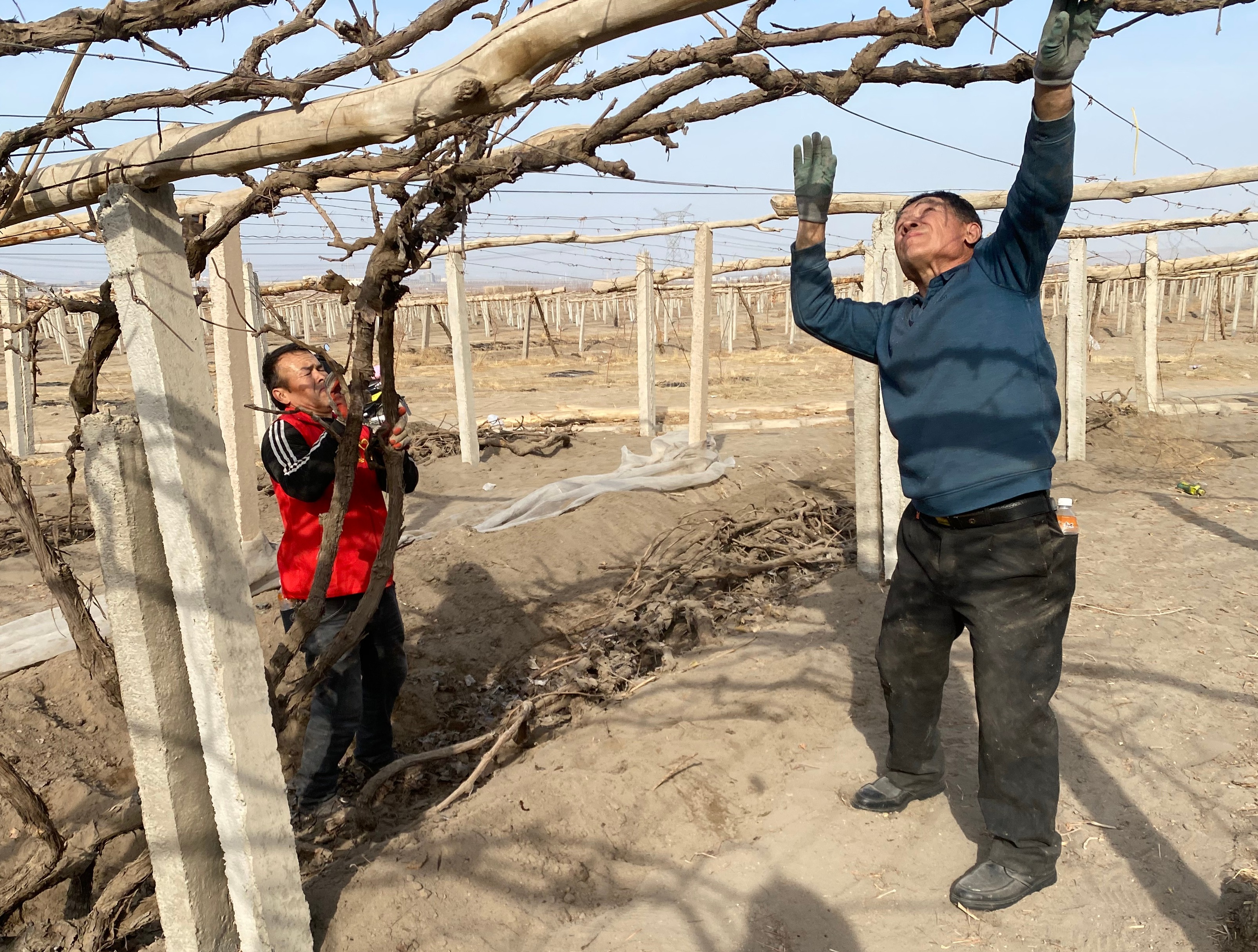 前期,工作队在走访中了解到,村民沙热汗·亚库甫因身体不好、腿脚不便,独自一人难以完成家中4亩葡萄地的开墩工作。随即,由村干部、工作队员和村民组成的志愿服务队来到她家葡萄园帮忙。现场大家分工协作,清理覆土、移除纱网、搭葡萄枝上架,干得热火朝天。