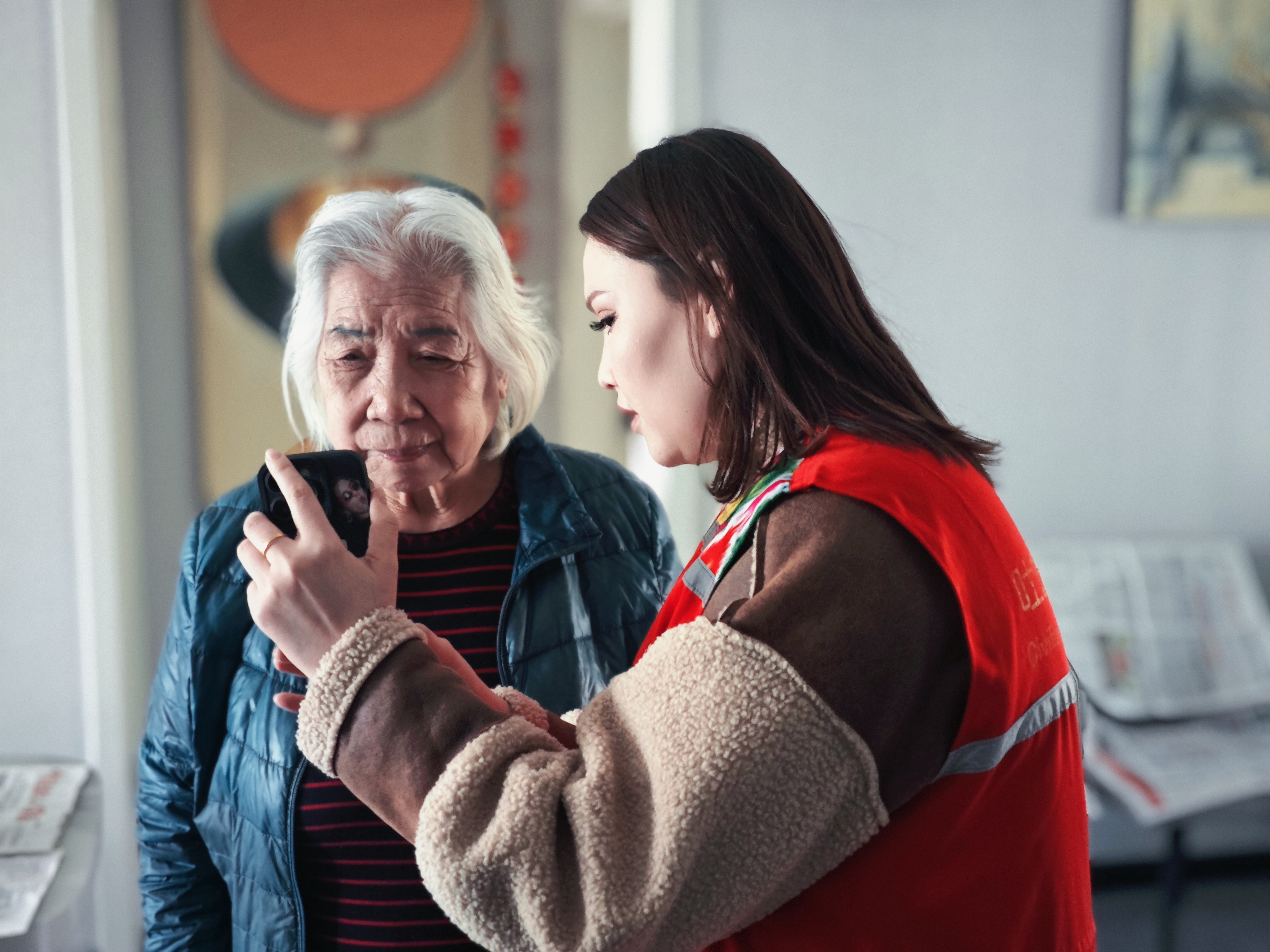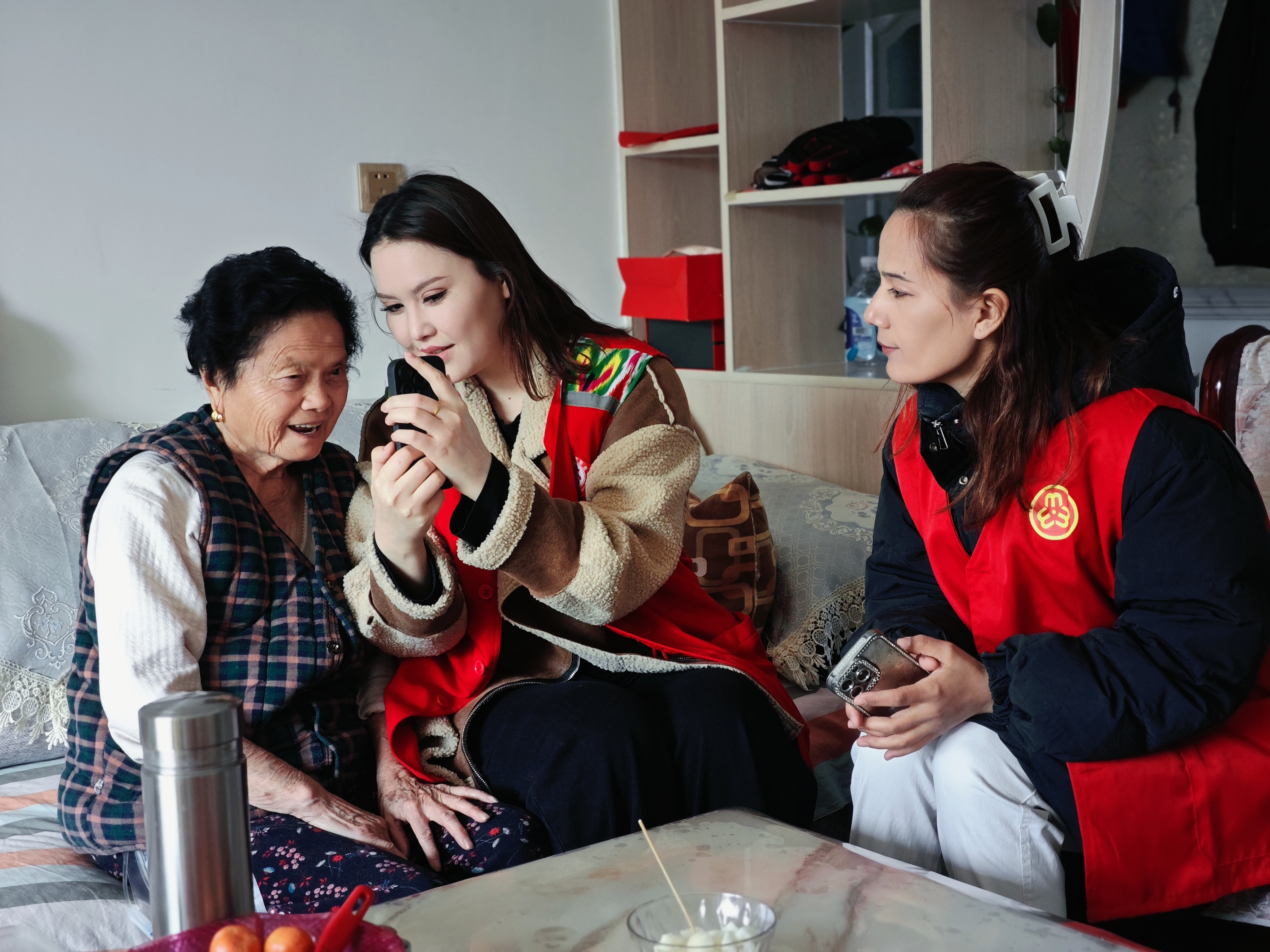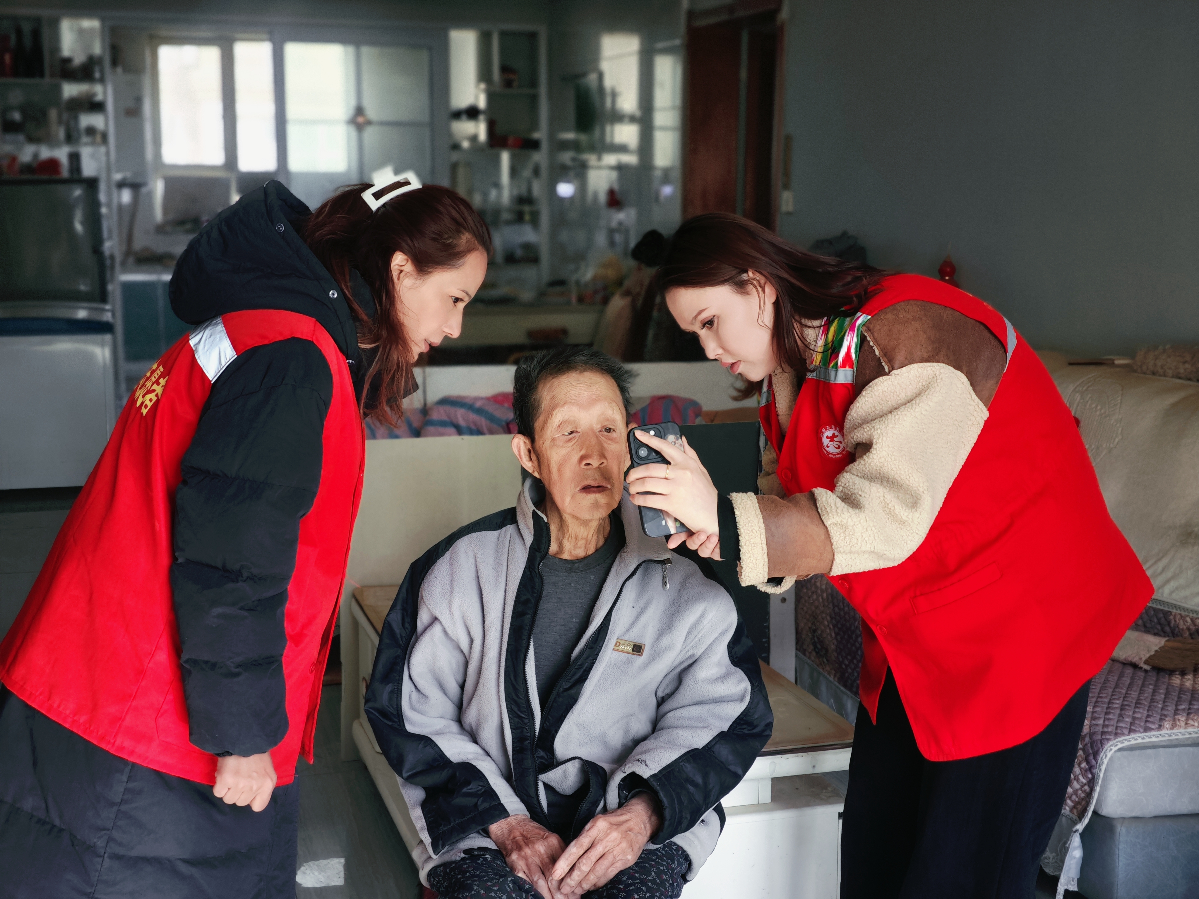 志愿者上门服务,帮助高龄老人完成资格认证。