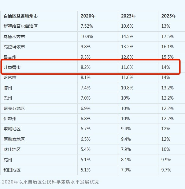 吐鲁番市融媒体中心讯(通讯员 张姝钰)近日,第十五次中国公民科学素质抽样调查结果正式公布,2025年吐鲁番市公民具备科学素质的比例达到14%,在全疆14个地州市中位列第四。