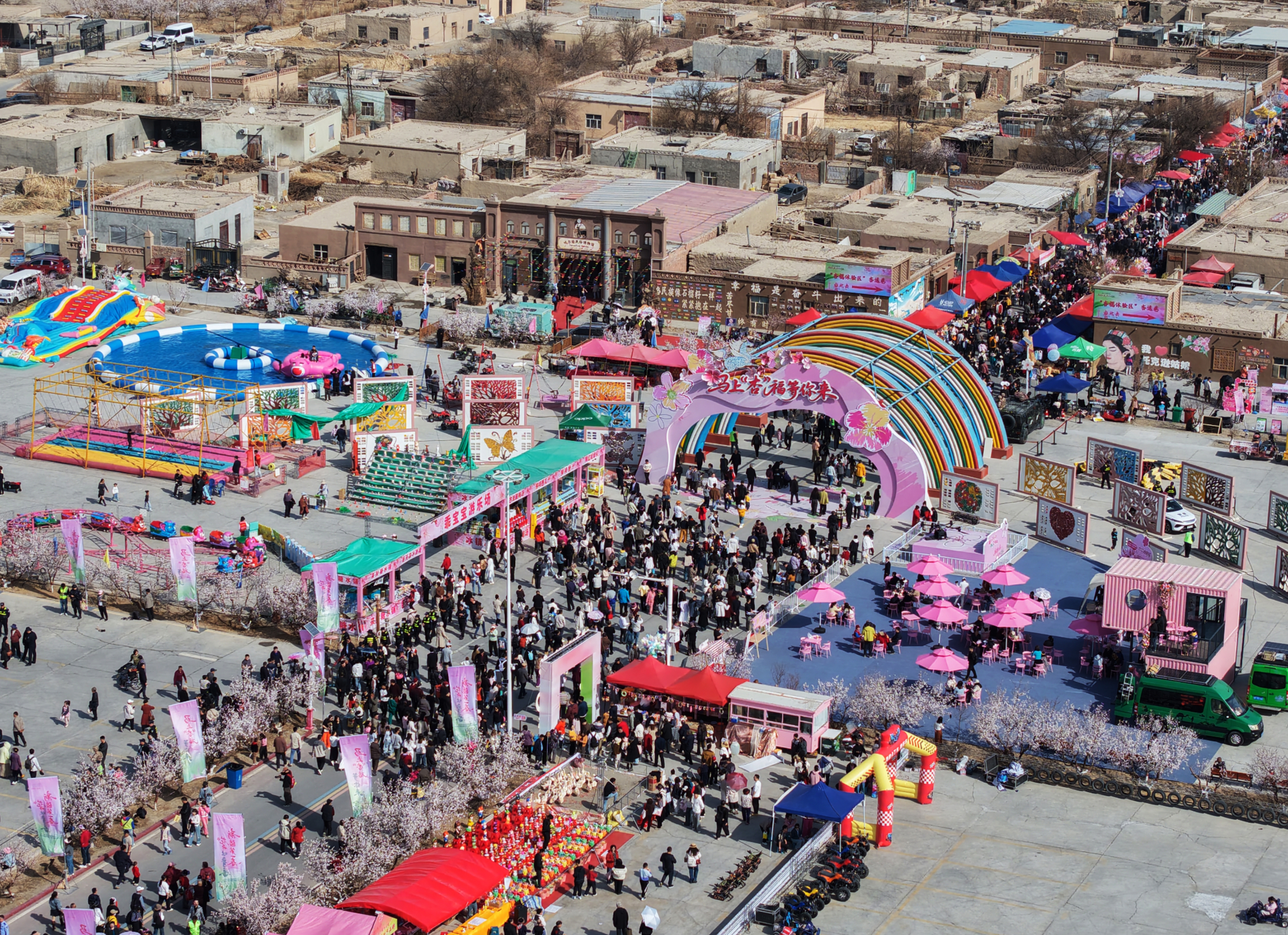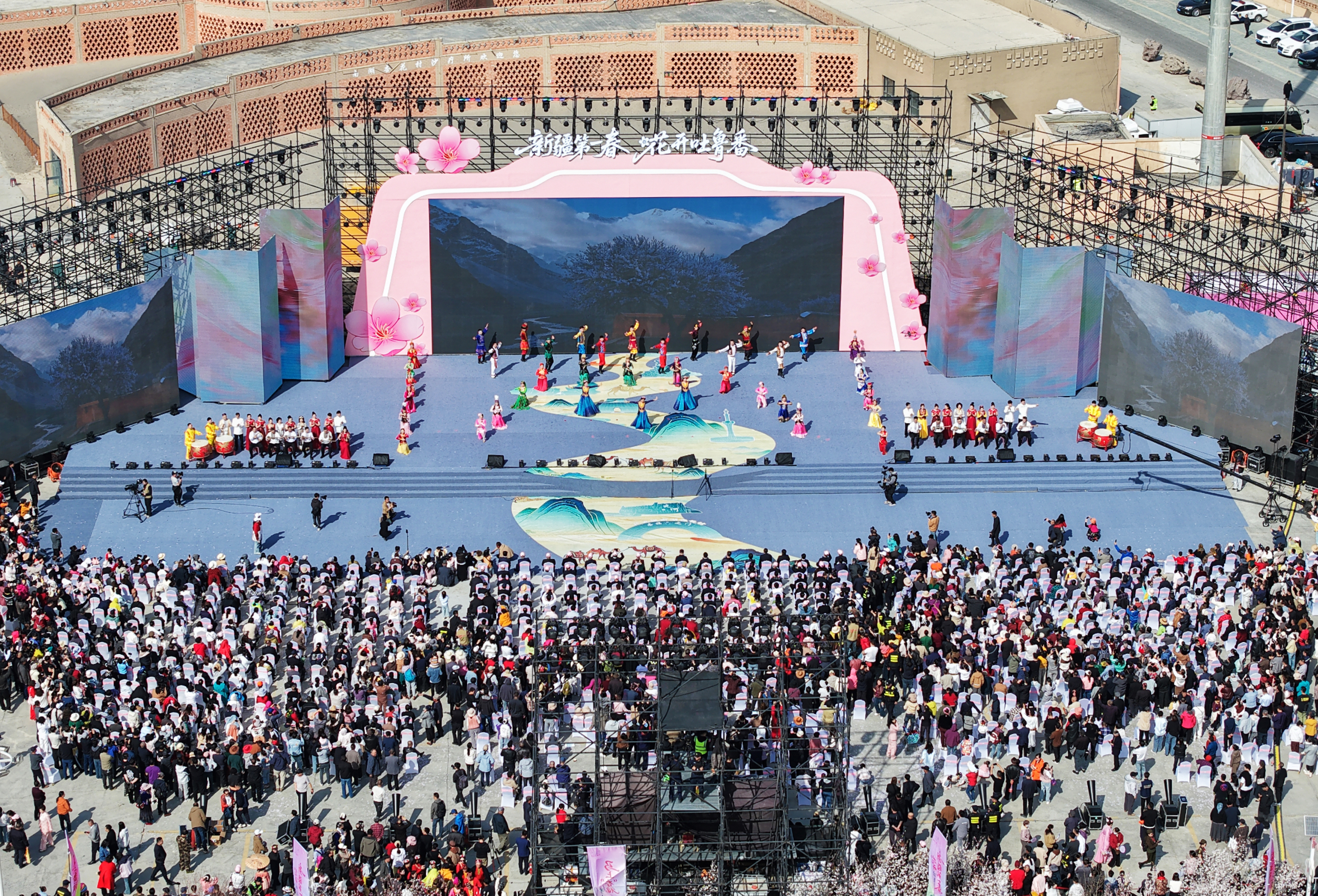 “新疆第一春 花开吐鲁番”马上“杏”福等你来2026吐鲁番杏花季系列文旅消费活动开幕式现场(航拍)。吐鲁番市融媒体中心通讯员 亚森江麦麦提 摄
