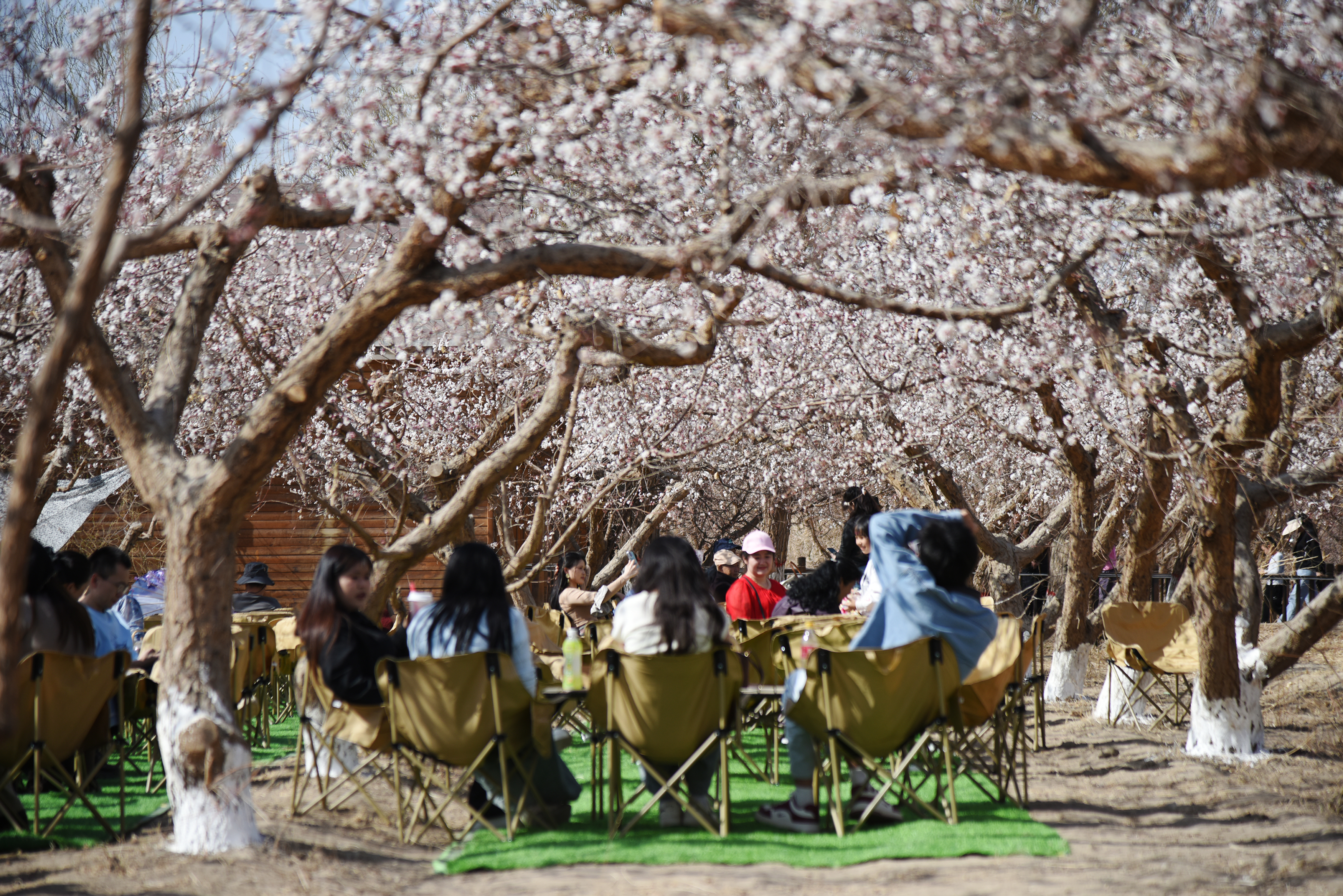 游客在杏花树下悠闲品茶。吐鲁番市融媒体中心记者 刘字昂 摄