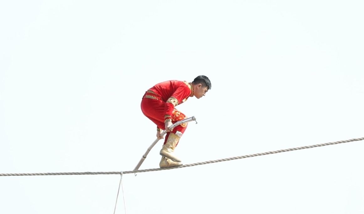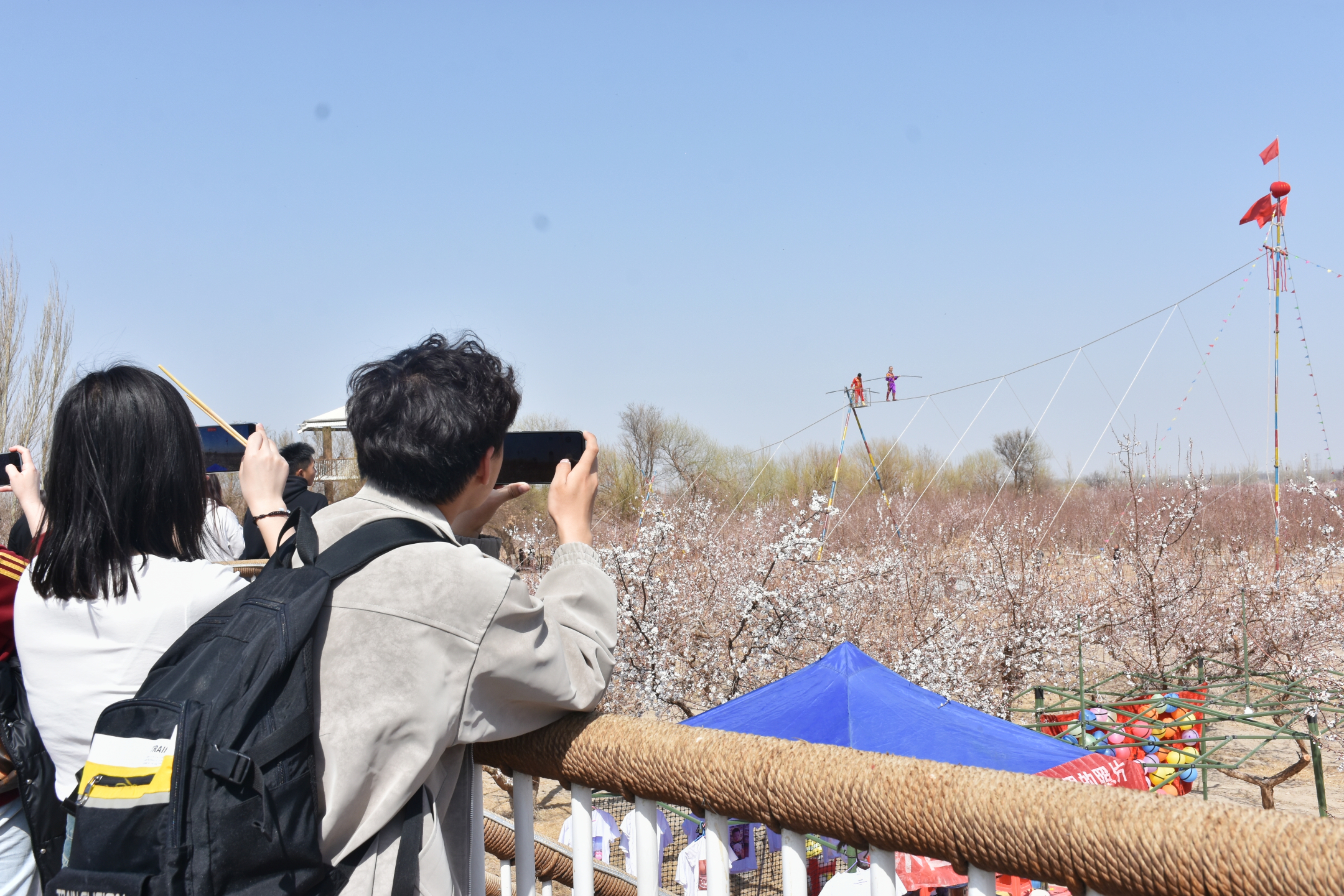 活动现场,一根高悬的钢丝在杏花园上空架起一道惊险“天路”。表演者手持平衡杆从容踏上钢索,接连展现高空行走、倒退行进、盘腿端坐等高难度动作。一系列表演行云流水、扣人心弦,每一个动作都牵动着现场观众的心弦。惊险而精彩的绝技轮番上演,引得游客阵阵惊呼,掌声与欢呼声此起彼伏,大家纷纷拿出手机记录下这震撼瞬间。