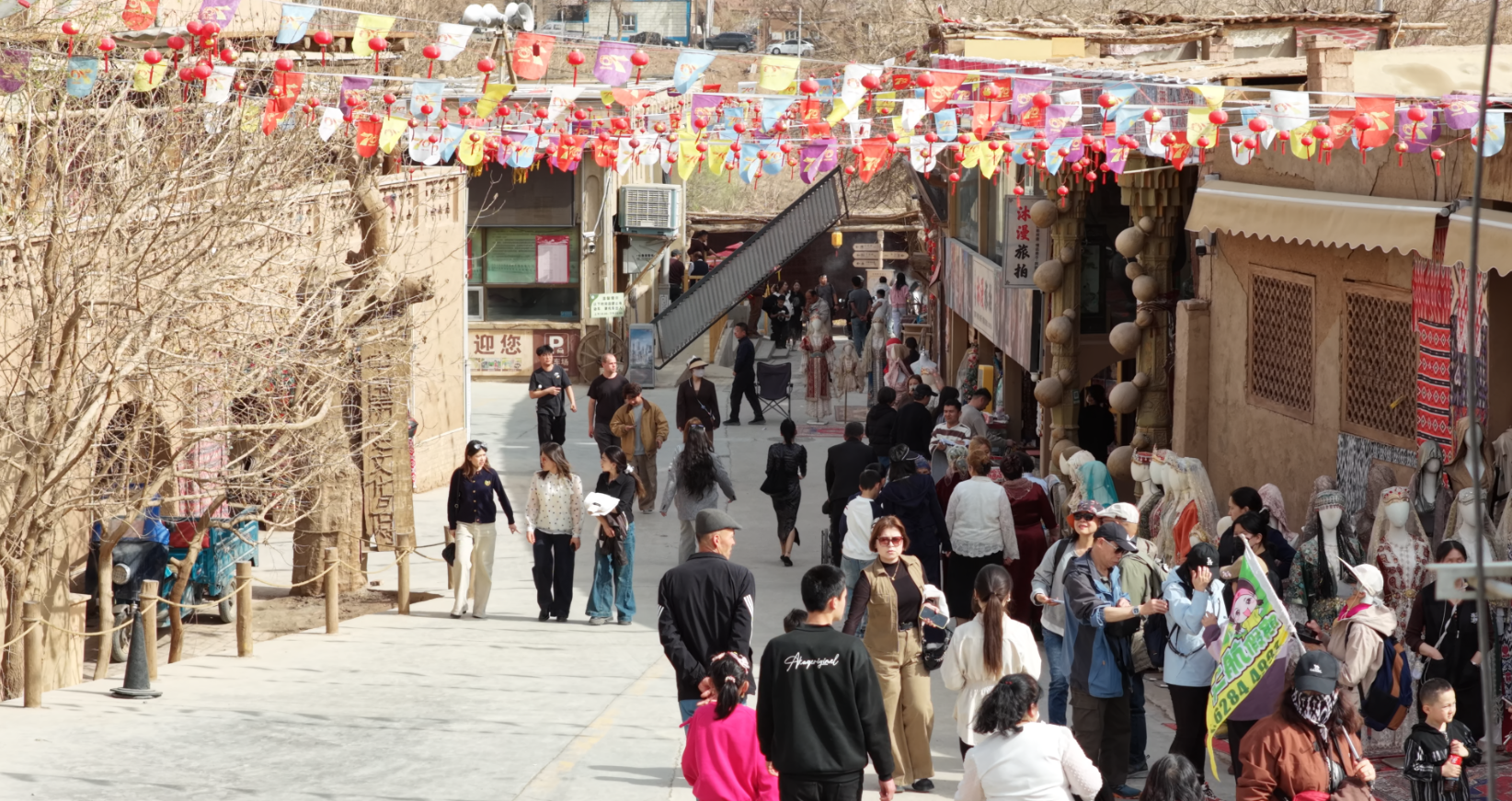 走进景区,杏花园繁花似锦,游客们穿梭其中,拍照打卡、赏花踏青,沉醉于春日美好。特色旅游小镇内,特色商铺、民俗体验、美食摊位应有尽有。在这里,游客既能品尝地道新疆美食,感受烟火气息,又能选购非遗文创与特色手工艺品,深度体验民俗文化。千年古村与烂漫繁花相映成趣,形成“赏美景、品民俗、探历史”一站式文旅体验,深受游客好评。