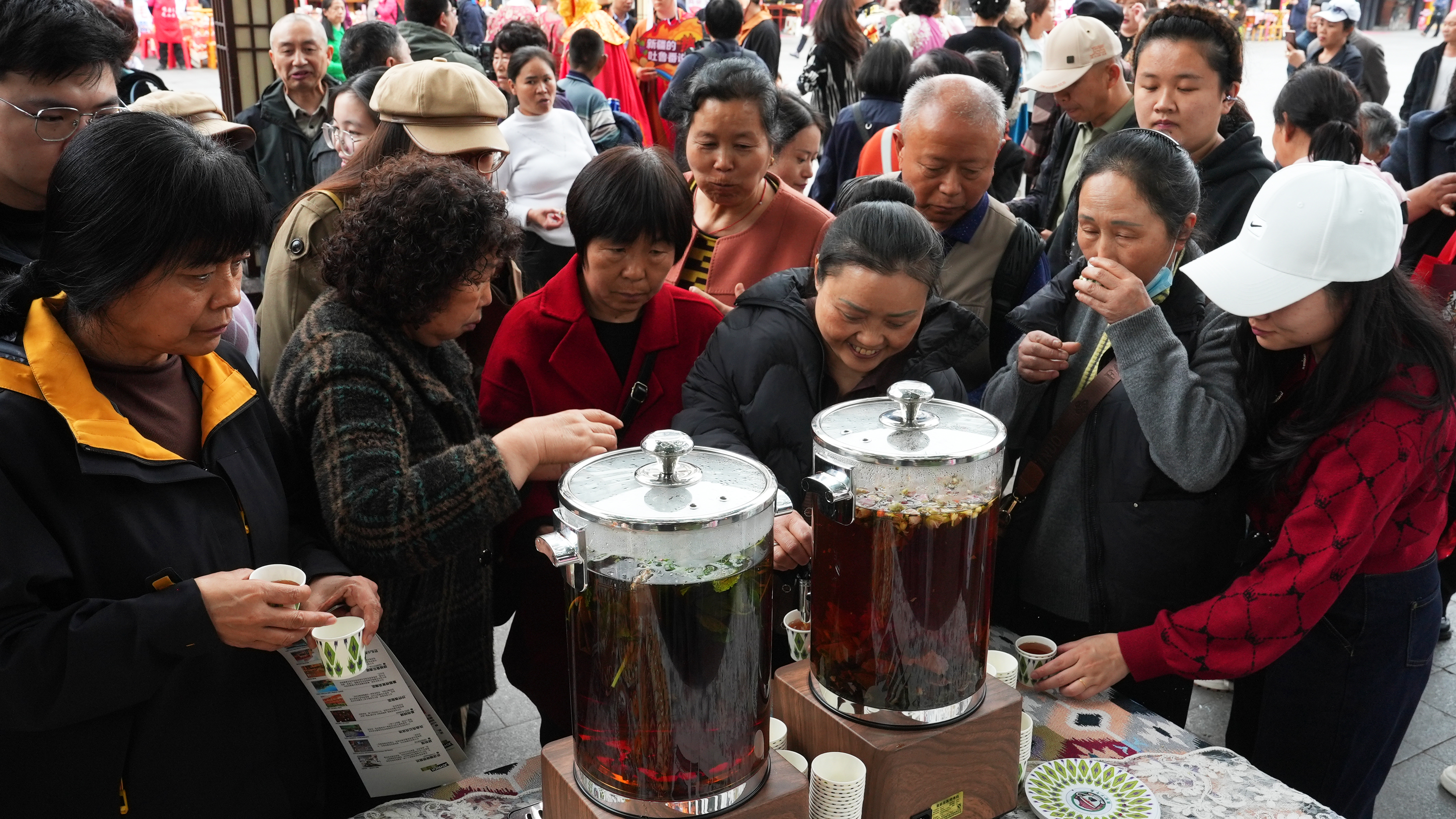 活动现场,吐鲁番特色下午茶成为一大亮点。茶饮丰富多样,有解腻提神的薄荷茶、风味独特的沙漠玫瑰花茶、远近闻名的桑葚茶,以及玫瑰月光白等9至12种养生与药茶。与之搭配的茶点同样令人目不暇接,特色葡萄饼干、核桃酥、酸奶馕碗、手镯馓子等纷纷登场,令人垂涎欲滴。重庆市民潘锓品尝后赞不绝口:“茶很不错,很香,很好喝,歌舞氛围也很好。”