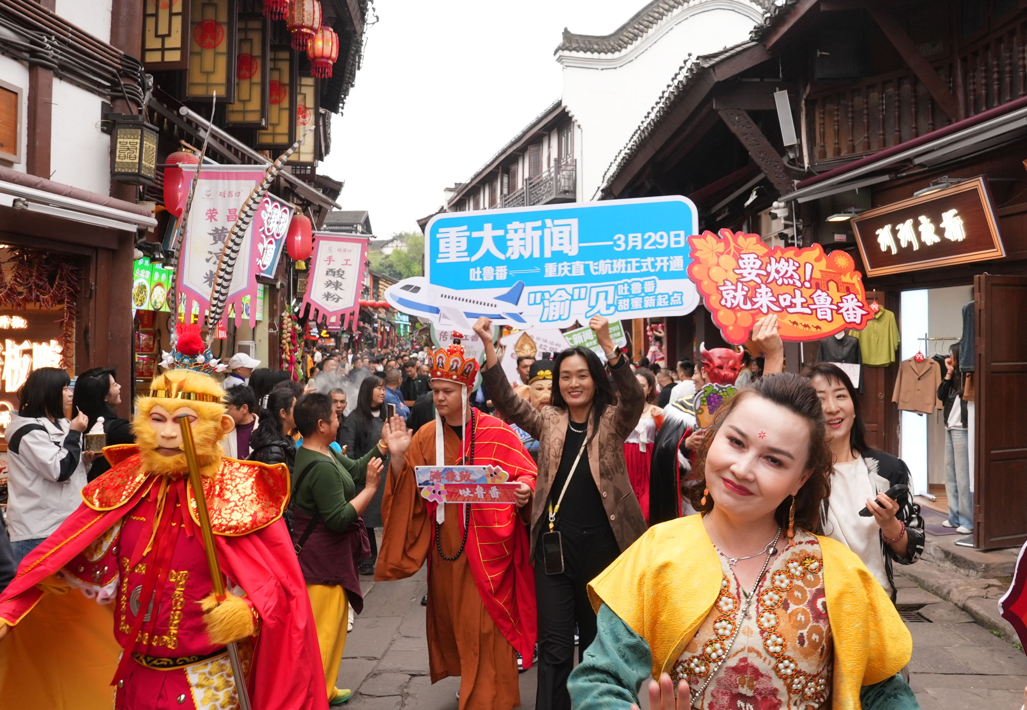 “说出吐鲁番3个景区的名字!”“来,我们猜拳!”……活动现场还设置了孙悟空、牛魔王、铁扇公主等NPC互动游戏,巧妙融入吐鲁番历史文化元素,吸引众人踊跃参与。来自德国的交换生杨大卫,此次来重庆参观学习,看到孙悟空、唐僧等形象激动不已:“这种方式让我对中国的文化充满好奇,更想去了解吐鲁番。”